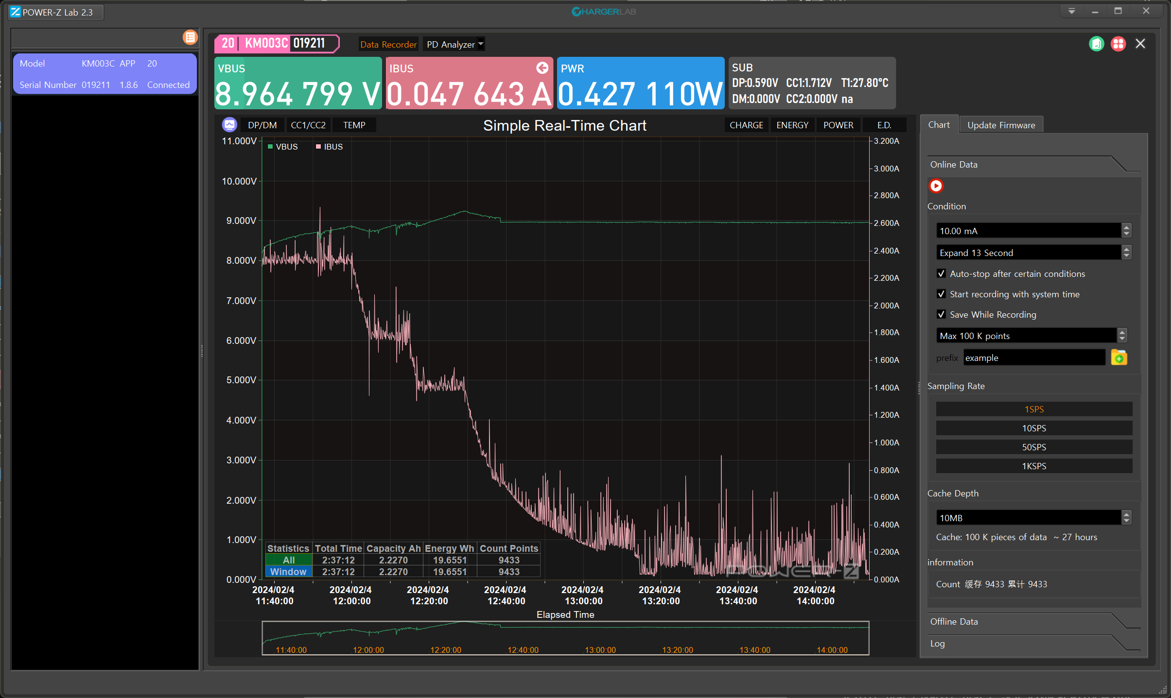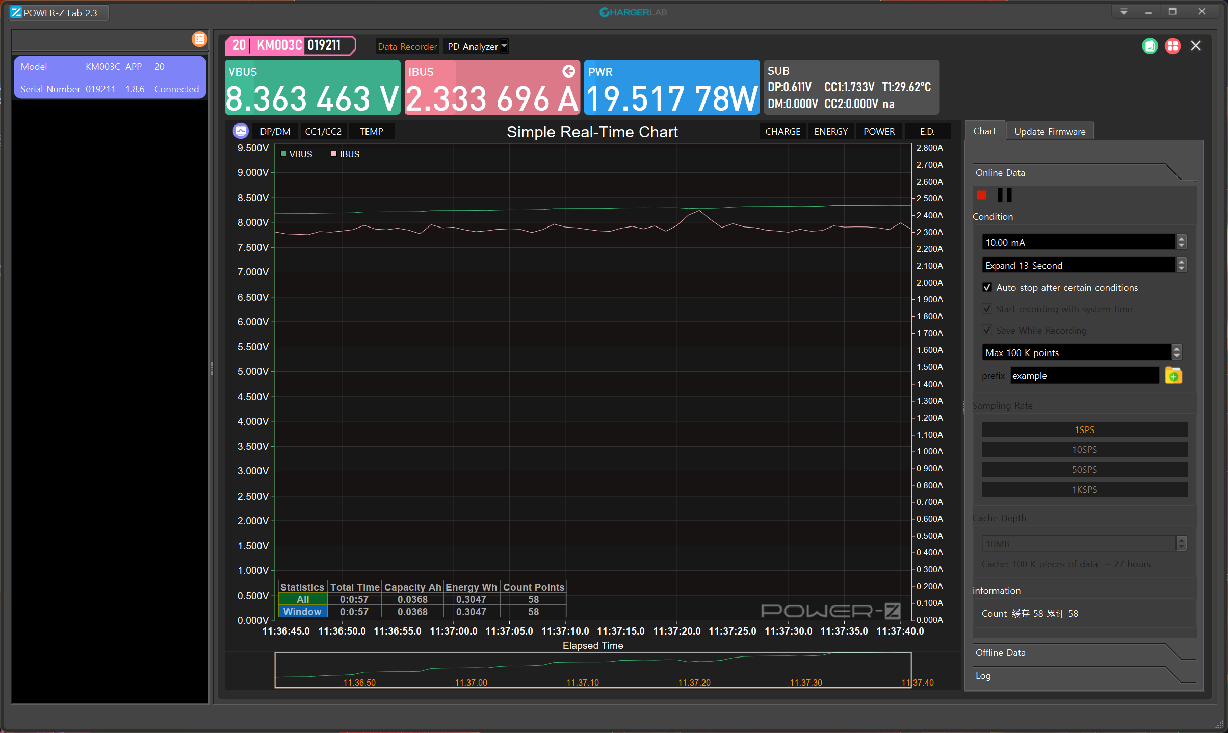 ChargerLab에서 제공하는 POWER-Z KM003 전용 모니터링 프로그램입니다. UI가 상당히 깔끔합니다. 우측의 Sample Rate의 수치를 올리면 아주 빠른 새로고침 표시가 가능합니다.