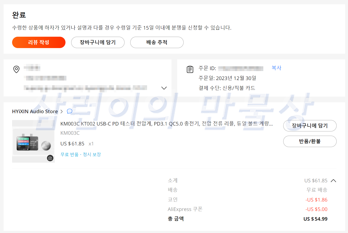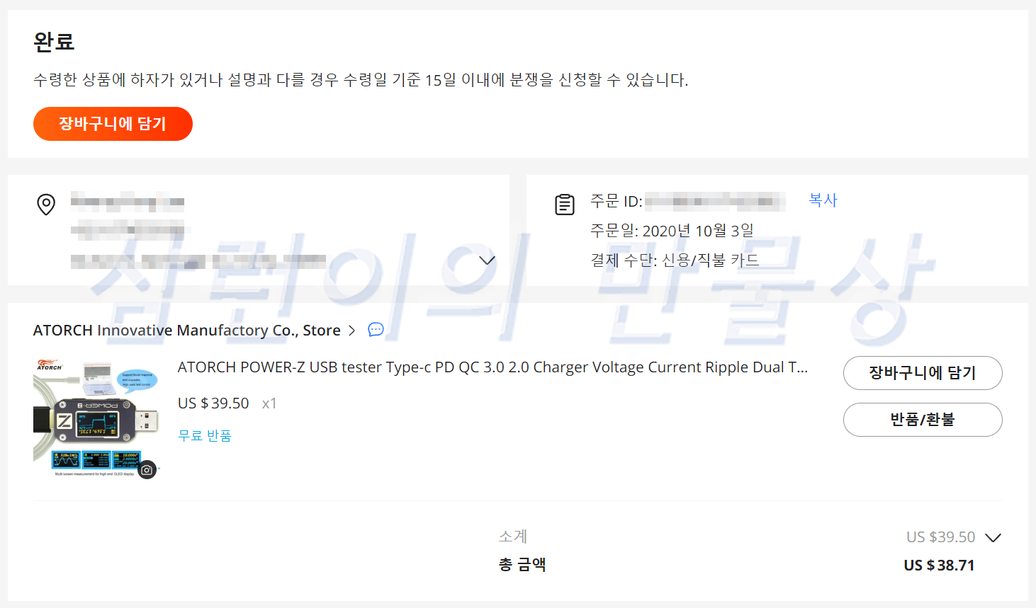 ChargerLab의 POWER-Z KM001을 언제 구입했는지 찾아보니, 2020년 10월 3일에 알리에서 38.71달러에 구매했습니다. 이 가격보다 더 저렴한 USB 계측기가 많았지만, 구글에서 검색 해보니 ChargerLab 회사의 USB 계측기가 고성능으로 알려져있었습니다. 그래서 구입 했고, 지금까지 정말 잘 써왔습니다.
