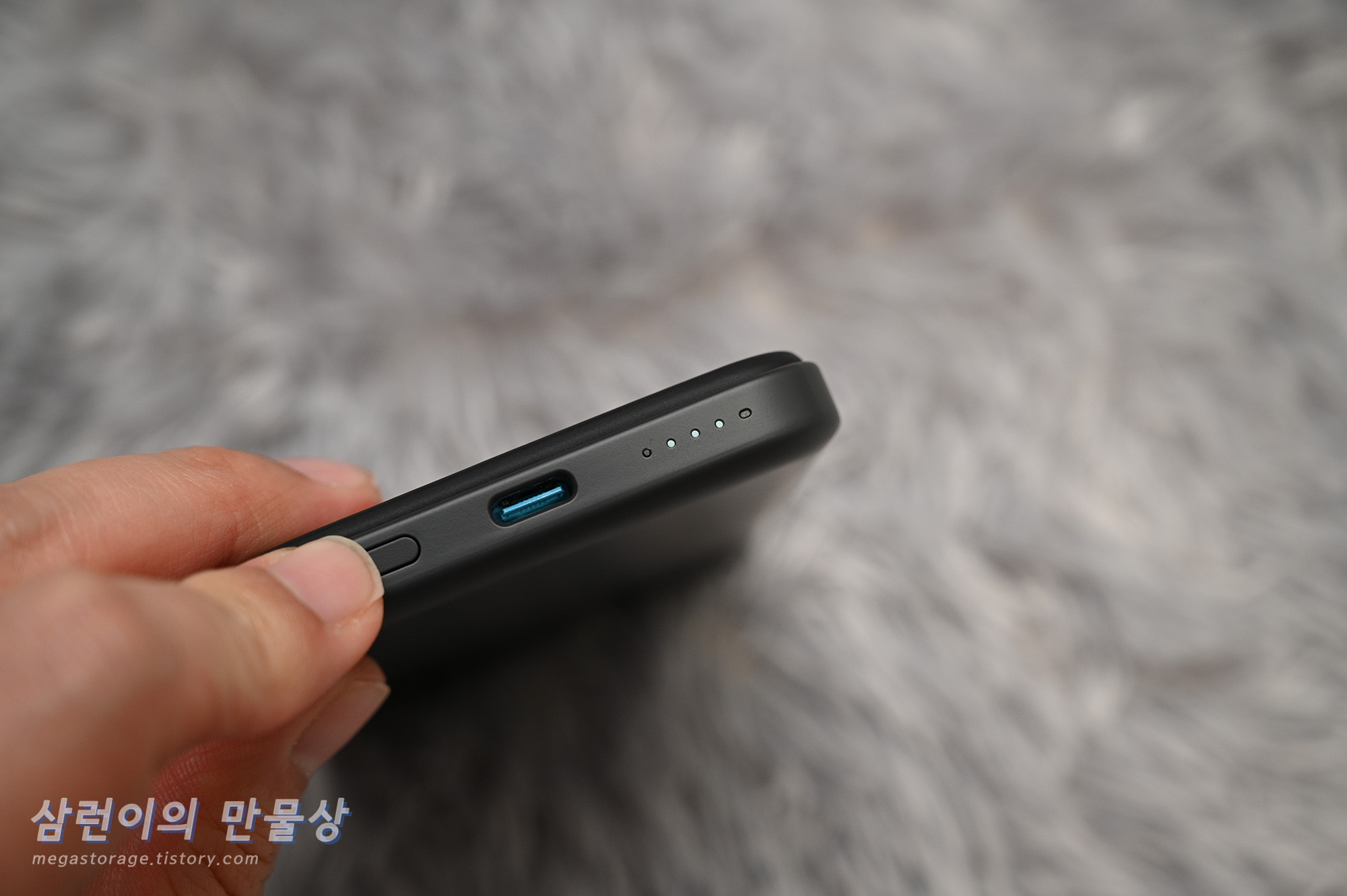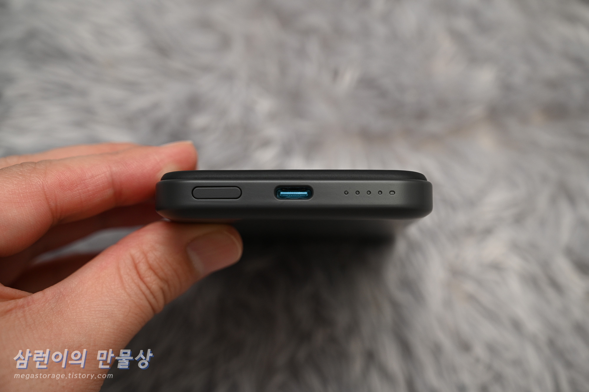 Anker 621 MagGo A1610의 하단부입니다. 좌측부터 전원 버튼, USB-C 단자 및 배터리 잔량(4칸)과 충전 진행 상태(제일 우측) LED 입니다.
