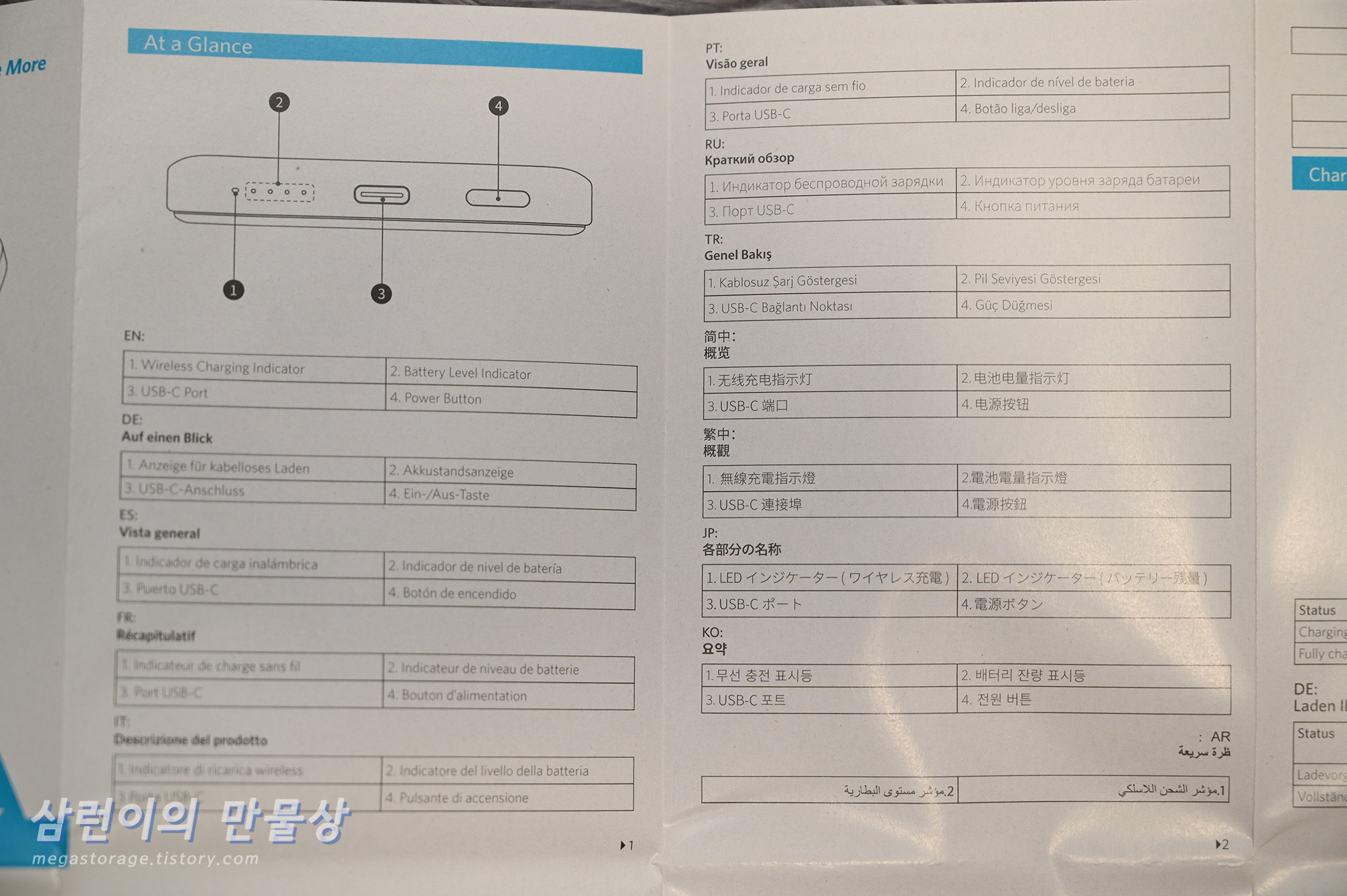 내부에는 보조 배터리 본체, 사용자 설명서 및 USB-C to USB-C 케이블이 있습니다.