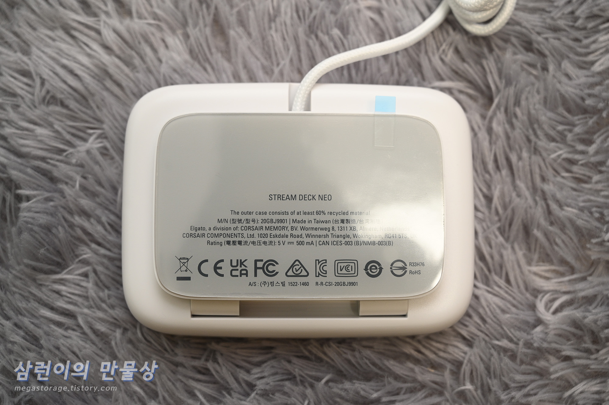 스트림 덱 네오입니다. USB 케이블은 기기와 붙어있으며 분리되지 않습니다.