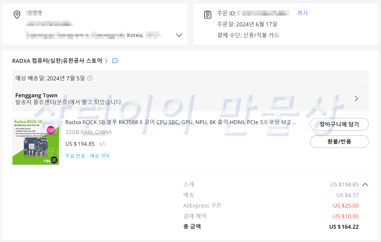 2024년 6월 17일에 알리익스프레스에서 ROCK 5B 32GB 개발보드를 164.22달러에 구매했습니다. 원래 200달러 초반대였는데 6월 알리익스프레스 행사 시작함과 동시에 194.85달러가 되었고, 쿠폰과 카드 할인을 적용하니 164.22달러가 되었습니다.