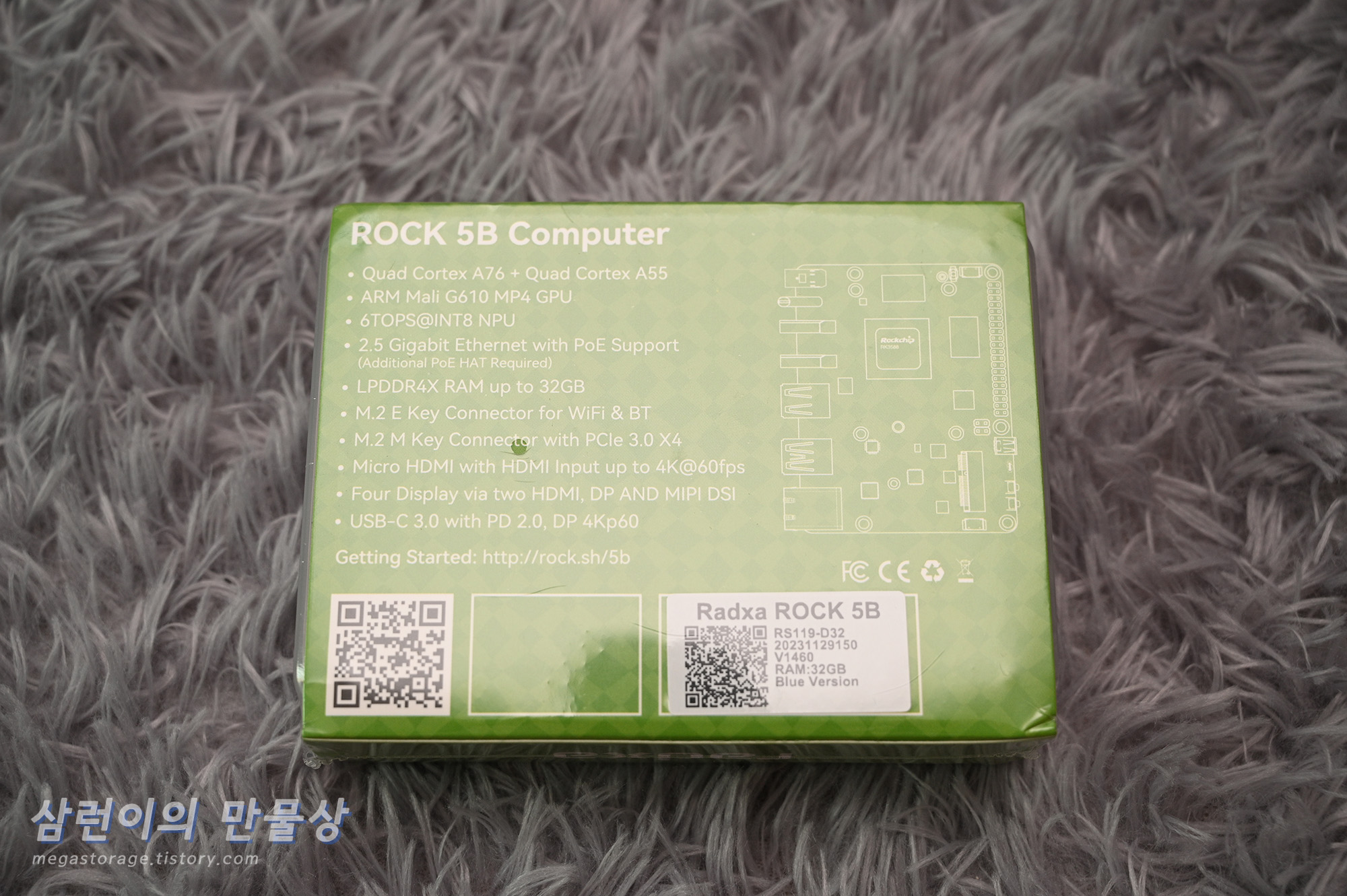 후면에는 ROCK 5B 개발보드의 간략한 스펙이 기재되어 있습니다. 제가 구입한 모델은 램 32GB 탑재 제품이므로, 우측 하단에 "RAM:32GB" 라는 문구가 있습니다.