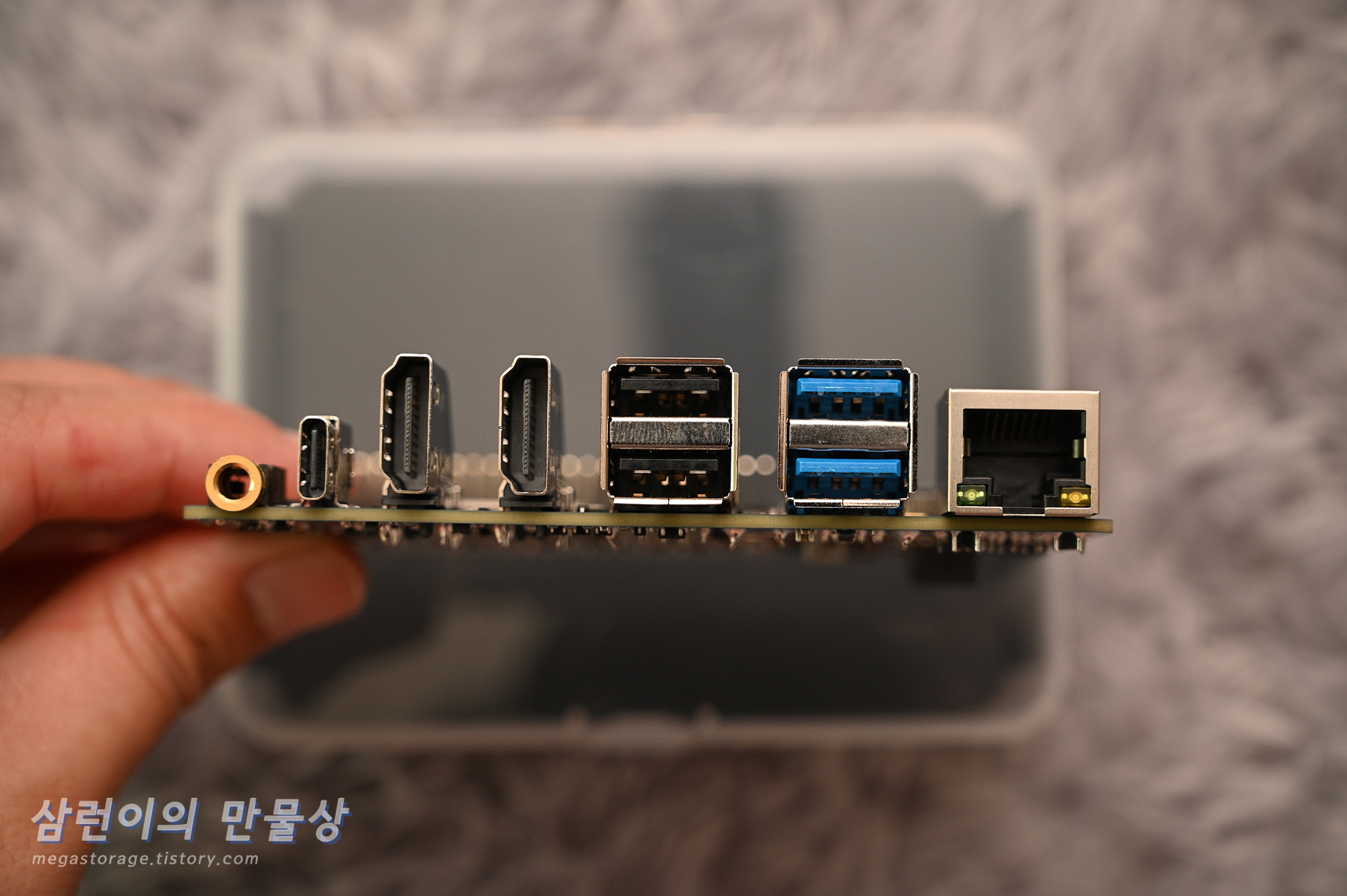 맨 좌측부터 오디오 포트, USB-C 포트(디스플레이 출력 또는 전원 입력), HDMI 출력용 포트 2개, USB 2.0 포트 2개, USB 3.0 포트 2개 및 2.5Gbps를 지원하는 이더넷 포트 1개입니다.