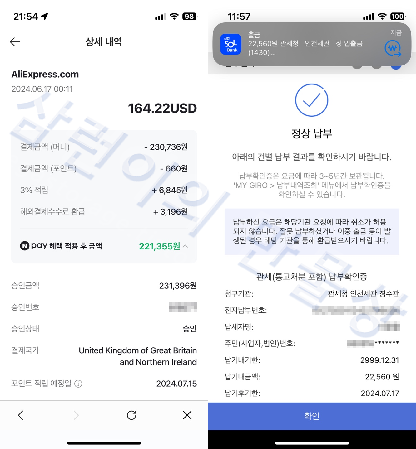 2024년 6월 17일 결제 후 6월 18일날 발송되었고, 약 일주일 후인 6월 25일에 도착했습니다. 관부가세는 저번 주 금요일인 6월 21일에 납부했으나, 물품이 인천항에 늦게 들어와서 며칠 밀렸습니다. 그래도 아주 빠르게 왔습니다.