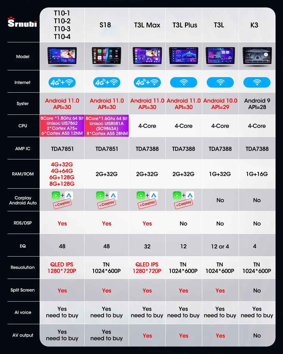 나머지 AMP, RDS/DSP, EQ, Split Screen, AI voice 등등은 잠시 고려 대상에서 제외하셔도 됩니다. 위의 모든 기능이 포함된 모델은 T10-1/T10-2/T10-3/T10-4를 선택하면 됩니다. 만약 "난 안드로이드 오토랑 카플레이만 되면 된다!"라는 분들은 T3L Max를 선택하시면 됩니다. T3L Max보다 저가 모델은 T3L Plus가 있겠네요. 그 외 모델은 고려하지 않아도 됩니다. 가성비가 좋지 못합니다.
