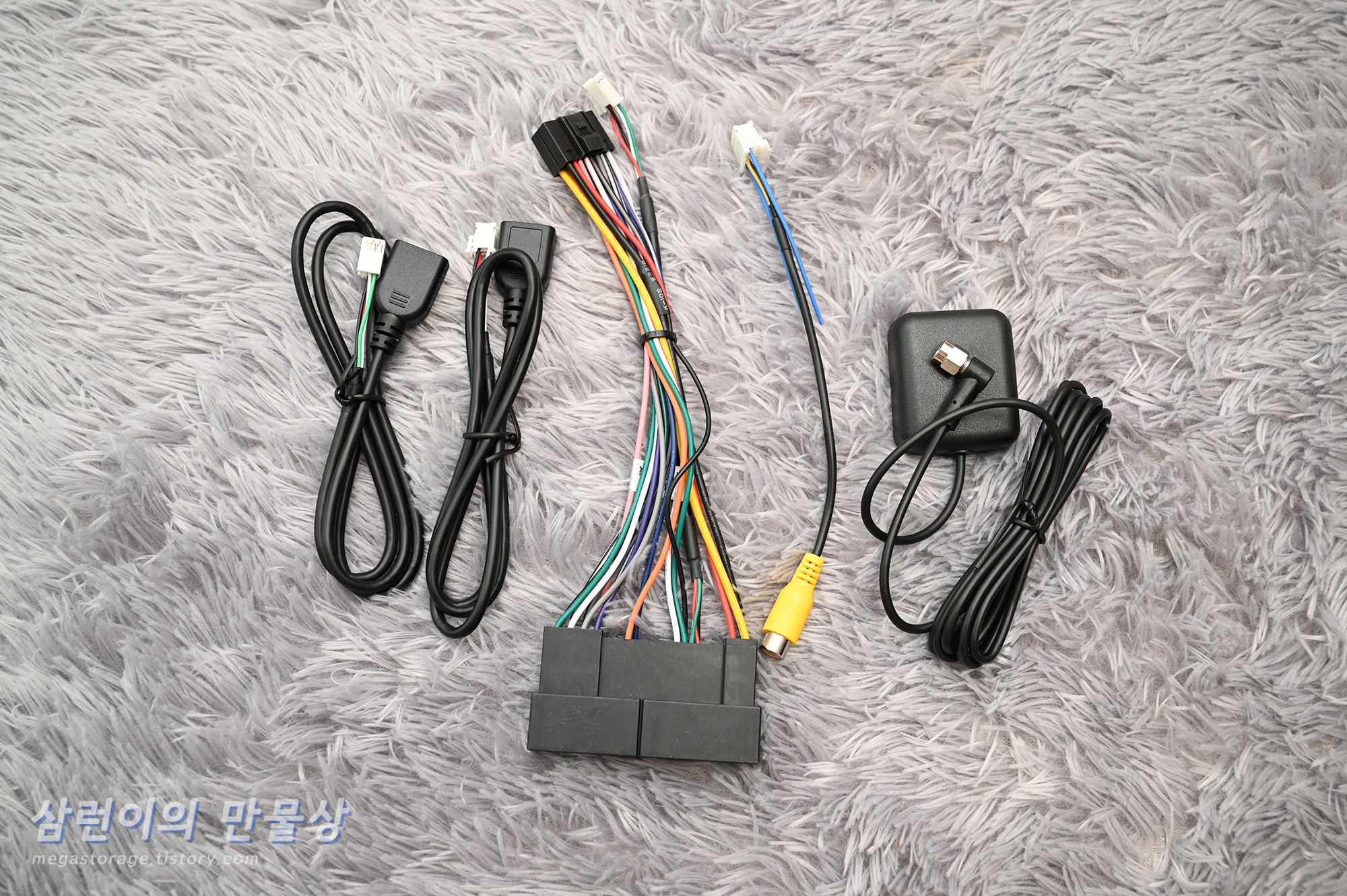 USB 2.0 케이블 2개, 메인 연결 케이블, 후방 카메라 연결 케이블 및 GPS 안테나 입니다.
