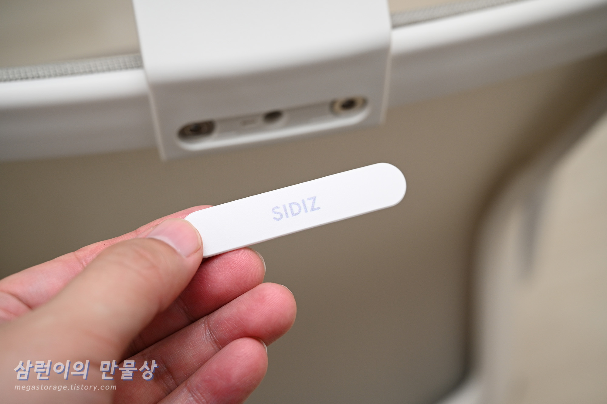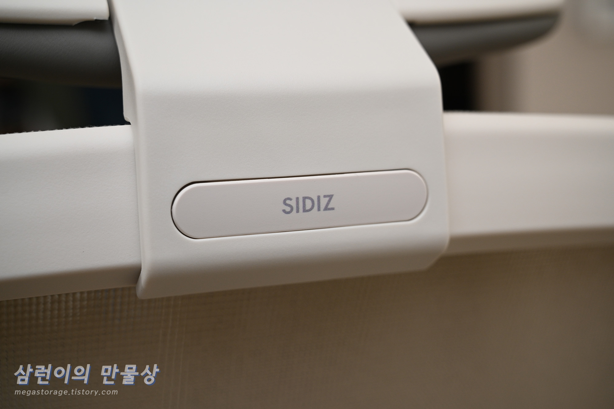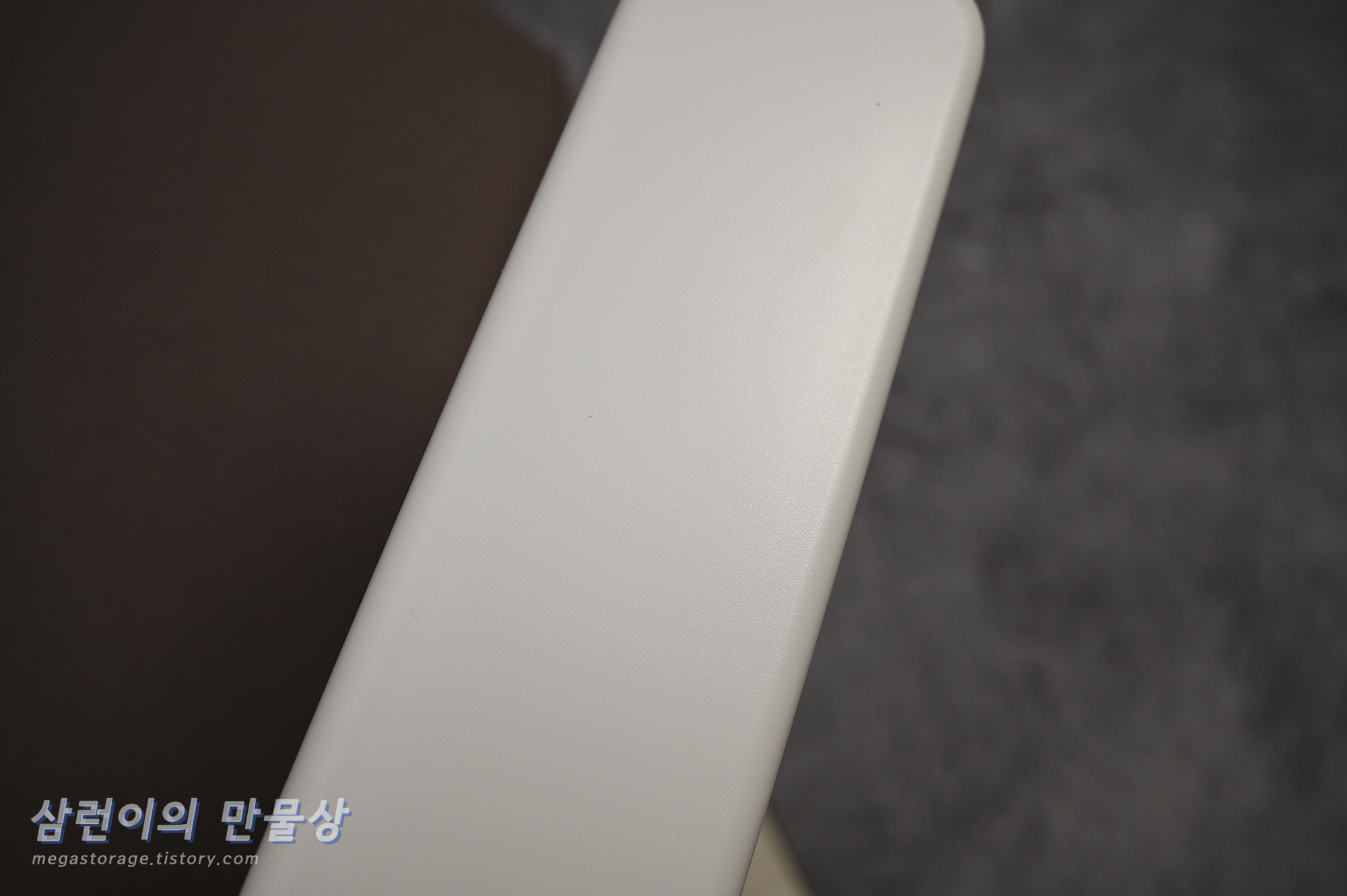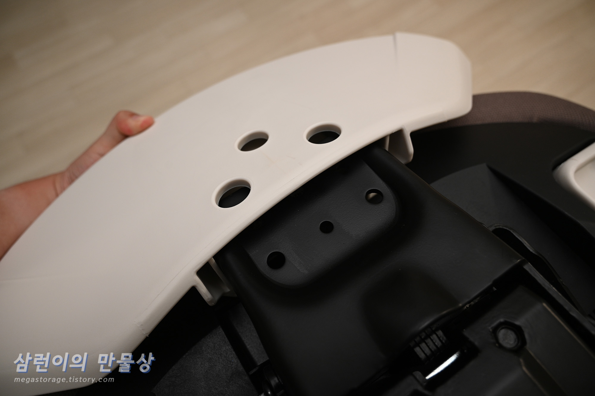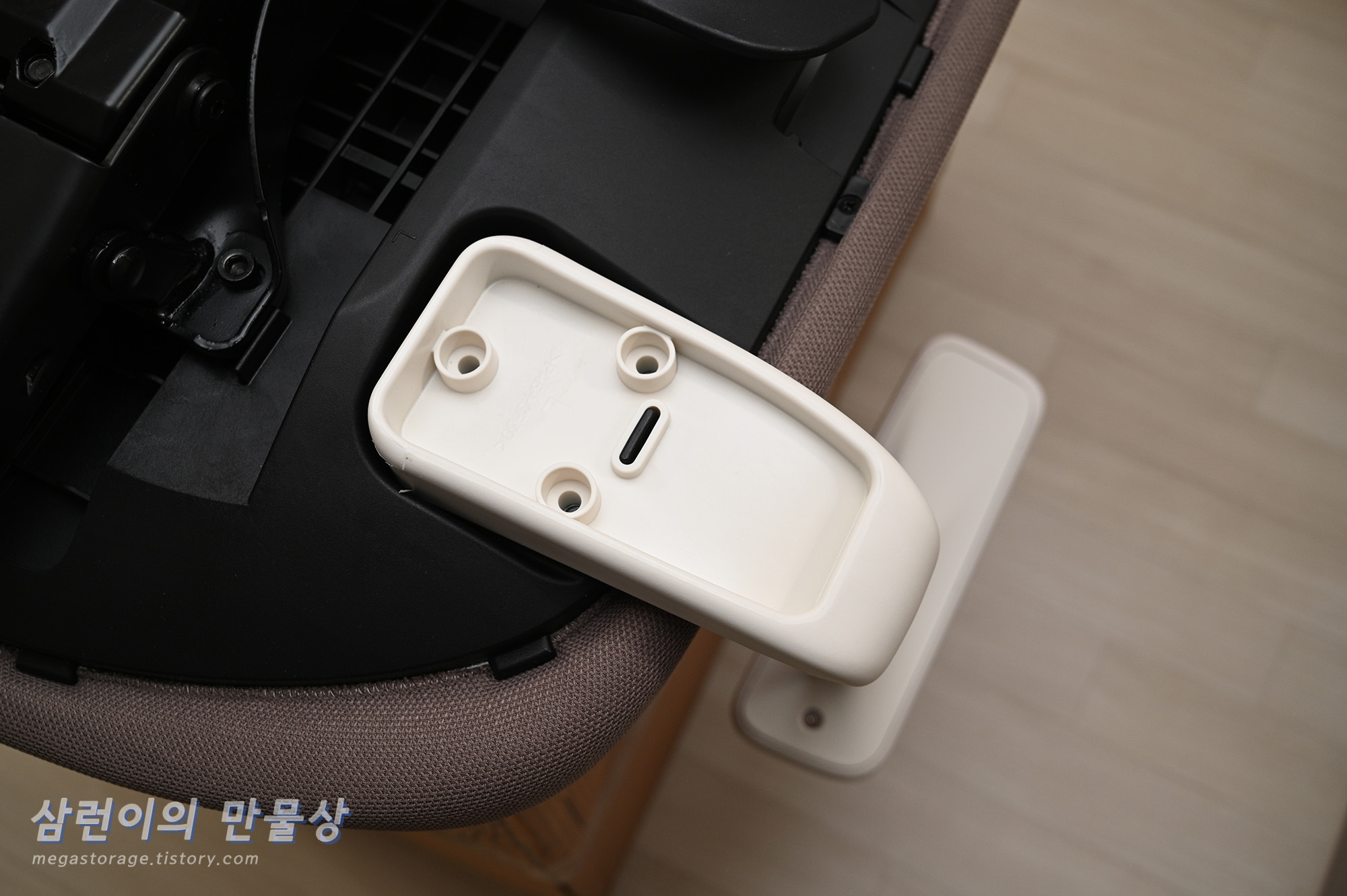팔걸이는 하얀색 플라스틱으로 되어 있습니다. 앞 뒤 조절은 되지 않지만, 앞 뒤 조절이 되는 의자를 써 본 경험으로는... 의자에 앉은 상태에서 자세를 바로 잡기 위해 팔걸이를 양 손으로 잡고 엉덩이를 의자의 안쪽으로 빼려는 순간, 팔걸이가 앞으로 "드르륵--" 하고 움직이는데.. 앞으로 미끌려서 불편하더라구요. 그래서 저는 고정된 팔걸이를 매우 선호합니다.