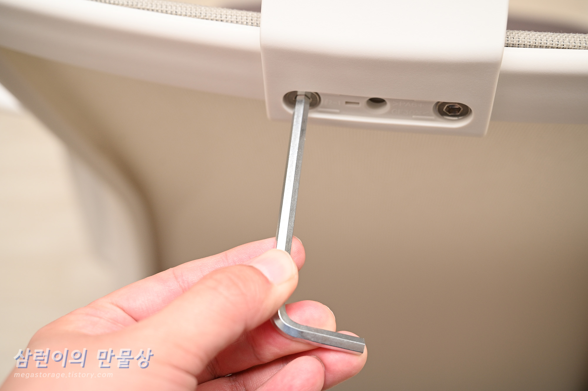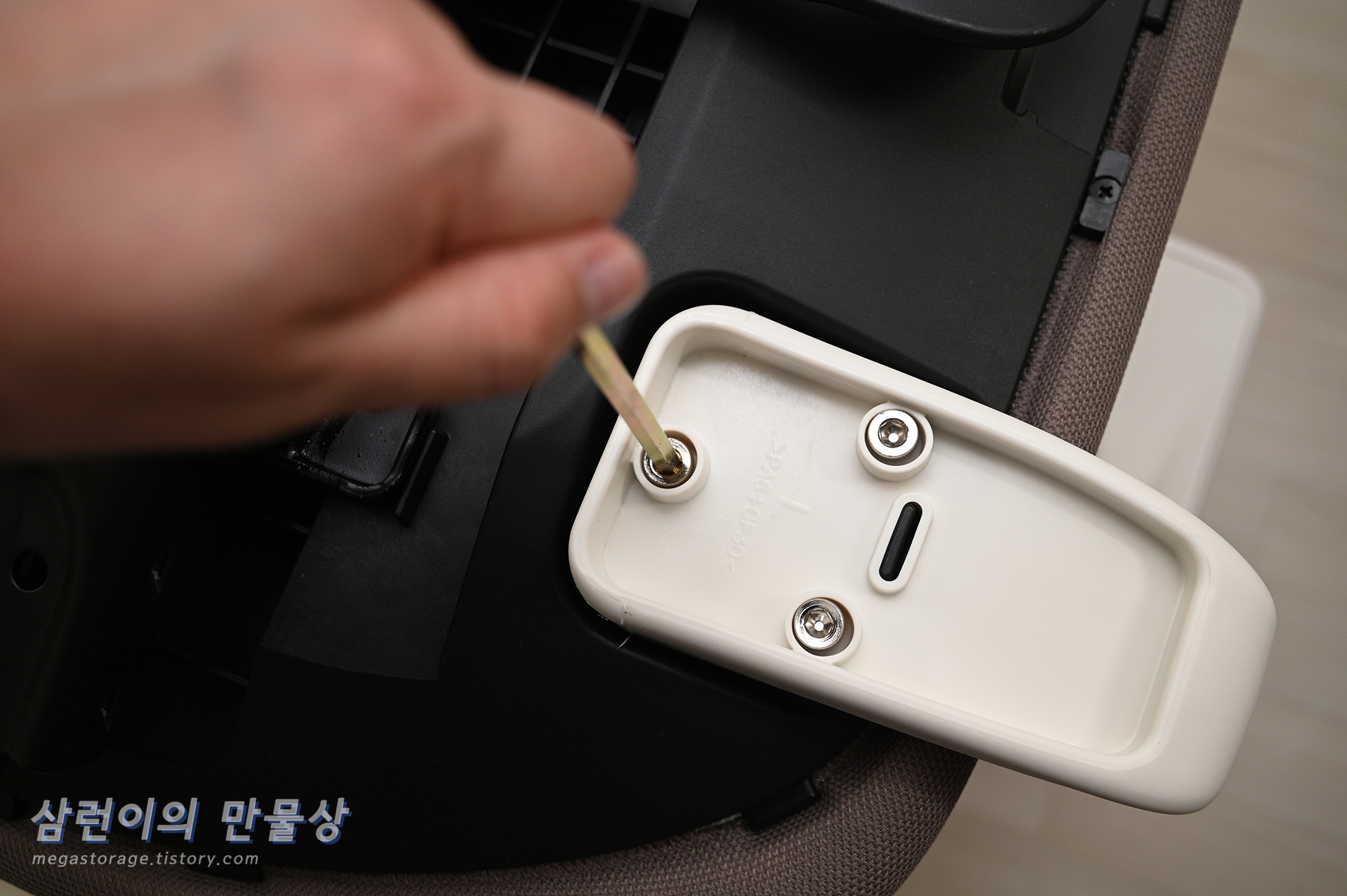 팔걸이 조립 볼트를 팔걸이쪽 구멍 3개에 넣은 후 동봉된 렌치로 조립합니다.
