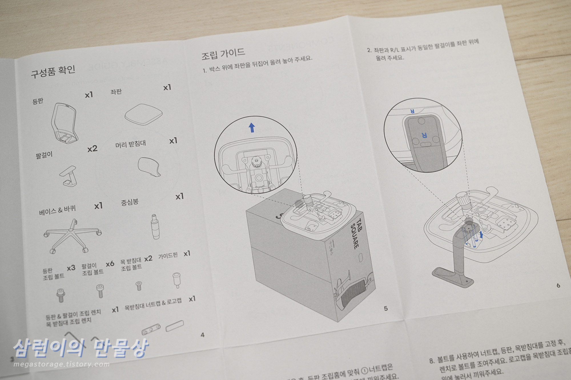 시디즈 탭스퀘어 조립 설명서는 매우 상세하게 설명되어 있습니다. 국내회사답게 조립 설명서의 퀄리티가 매우 훌륭합니다. 어느 시점에서 어떤 나사를 사용해야 하는지 구분이 매우 쉽습니다. 조립 설명서의 반대면에는 영문 설명서가 있습니다.