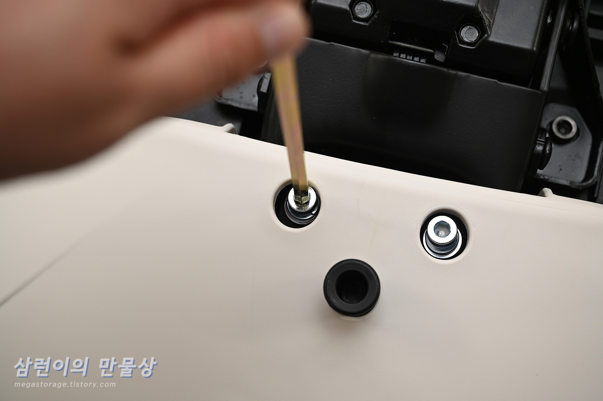 동봉되어 있는 '등판 조립 볼트' 3개를 넣고 조여줍니다. 고정이 잘 되지 않을 수도 있습니다. 이렇게 저렇게 잘? 하면, 잘 들어갑니다.