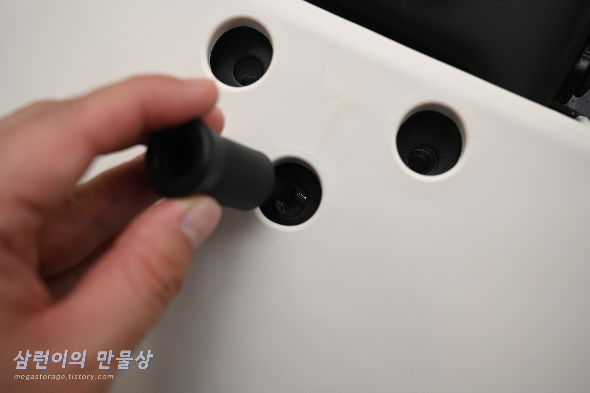 그리고 '머리 받침대'를 손으로 고정한 후 동봉되어 있는 '목 받침대 조립 볼트' 2개로 조여주면 됩니다. 여기에서도 가이드핀을 사용하면 되긴 하나, 의자를 세워둔 상태에서는 자꾸 빠져서 사용이 어려웠습니다.