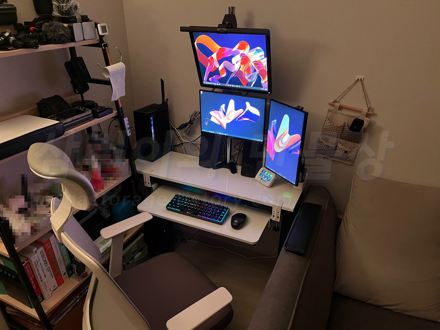마지막으로 미니미니한 제 컴퓨터 책상 셋팅 보고 가세요. ㅎㅎ 기존에 사용하던 LG 27인치 4K 모니터인 27GN950을 제거한 후 제우스랩 Z16P 2대 (중앙, 우측 세로)와 예전 부터 사용하고 있었던 Dell 17인치 4:3 모니터인 E1715S (위쪽)으로 트리플 모니터 구성하여 사용하고 있습니다.