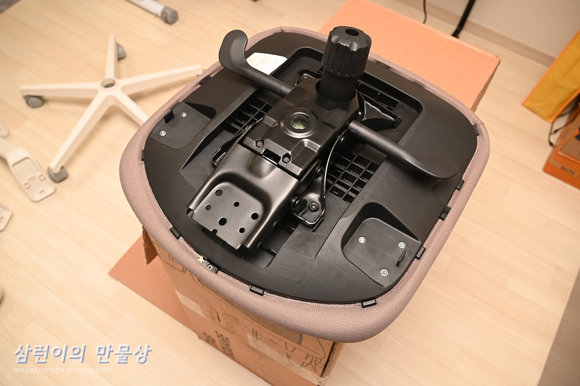 그리고 뒤집혀있는 좌판의 중앙부에 넣어주면 됩니다. 이렇게 시디즈 탭스퀘어 조립의 80%가 끝났습니다.
