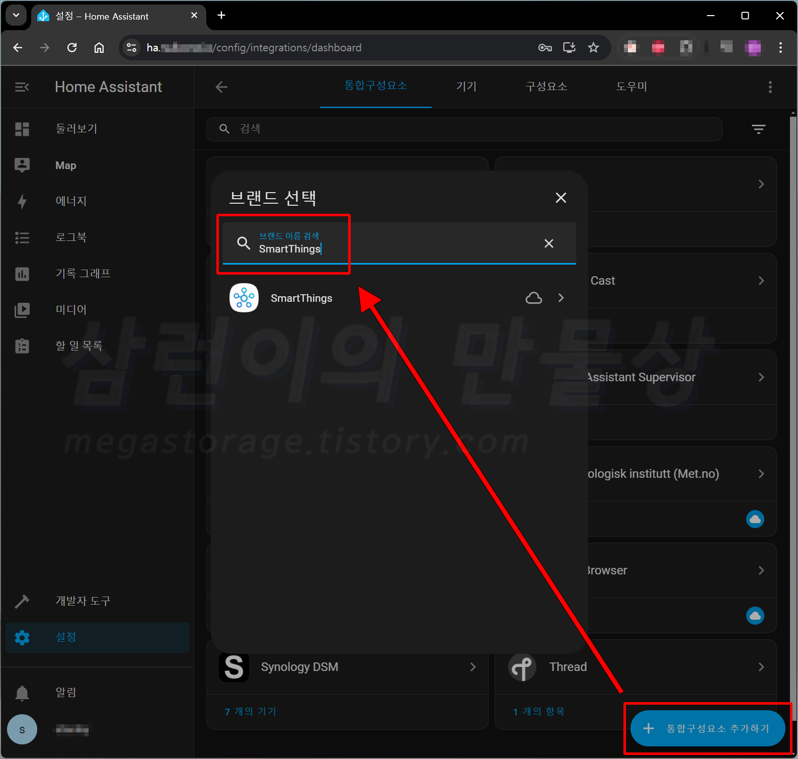 우측 하단의 '통합구성요소 추가하기' 버튼을 클릭한 후 SmartThings를 입력합니다. 그러면 SmartThings가 검색됩니다. 클릭합니다.