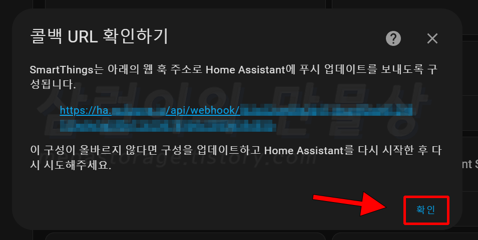 일반적으로 위와 같은 에러가 뜰 수도 있습니다. "Home Assistant가 SmartThings에서 업데이트를 수신하도록 올바르게 구성되지 않았습니다. 웹 훅 URL이 잘못되었습니다." "안내를 참고하여 구성을 업데이트하고 Home Assistant를 다시 시작한 후 다시 시도해주세요."