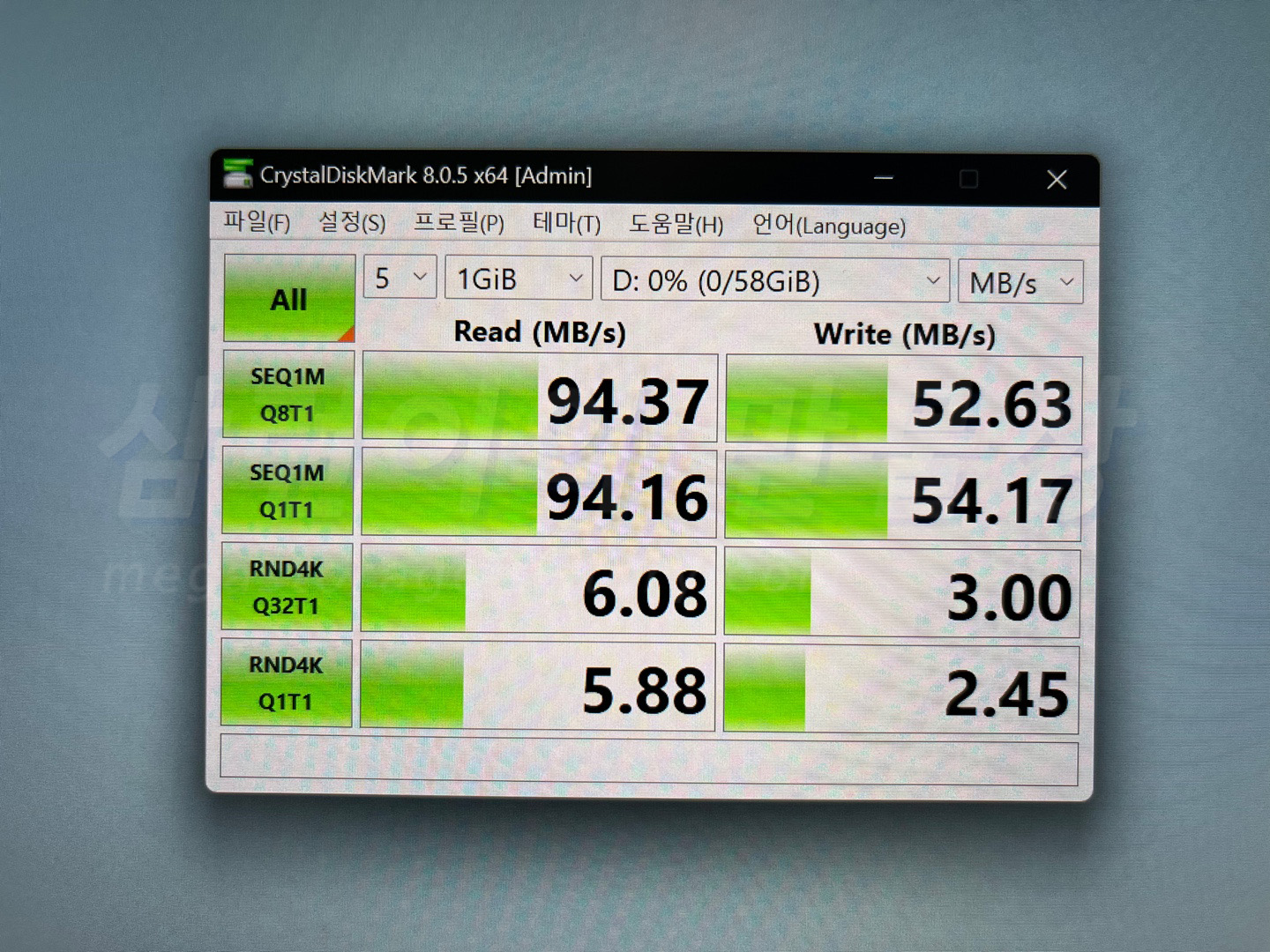 CrystalDiskMark로 속도 측정을 했습니다. 와... 읽기 속도가 무려 95MB/s 나옵니다. 포장지에는 100MB/s 라고 적혀있었지만, PC와 리더기의 발열 상태에 따라서 조금 줄어들 순 있습니다.