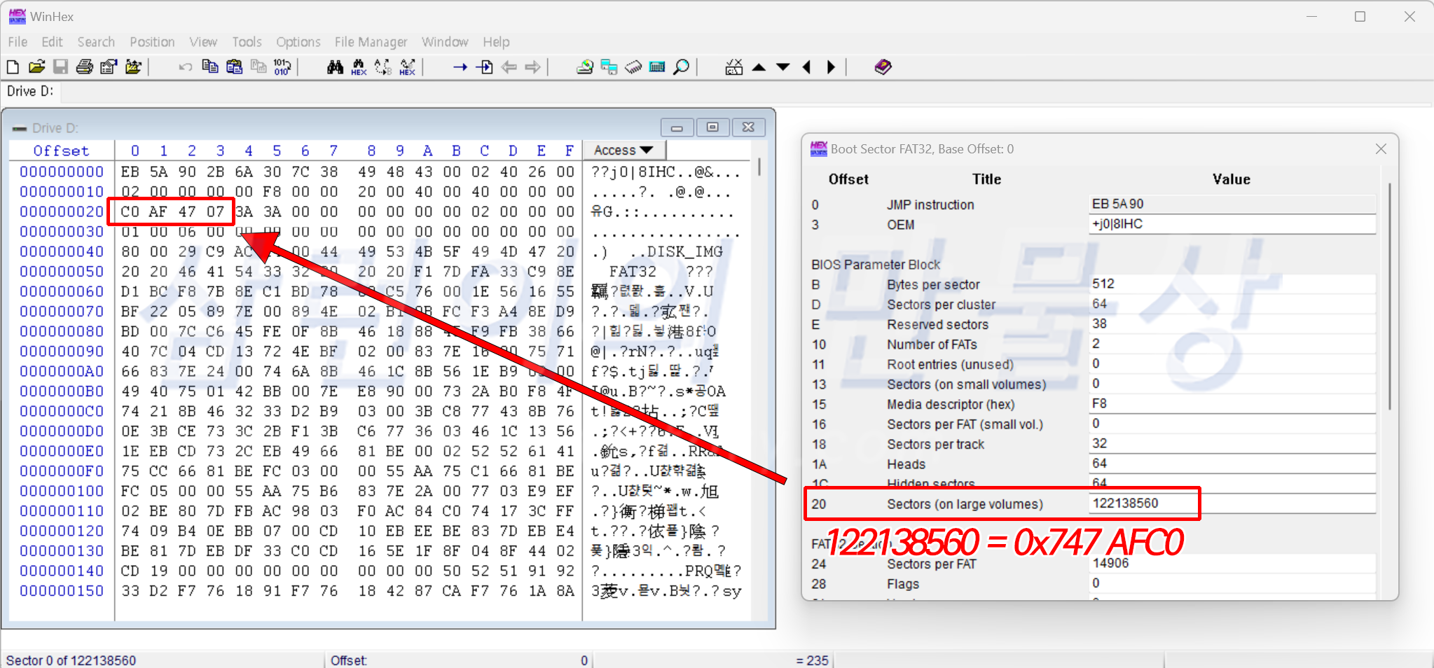 microSD 메모리 내부의 BIOS 파라미터 값 중 하나가 임의로 편집되었습니다. 여기서 'Sectors' 값 입니다. 일반적으로 디스크 전체 용량은 "전체 섹터" X "섹터당 바이트" 공식을 따릅니다. 그래서 122,138,560 x 512 = 62,534,942,720 바이트라는 값이 나옵니다. Sectors 값은 실제로 8,388,608 이어야 했습니다. (8,388,608 x 512 = 4,294,967,296 바이트)