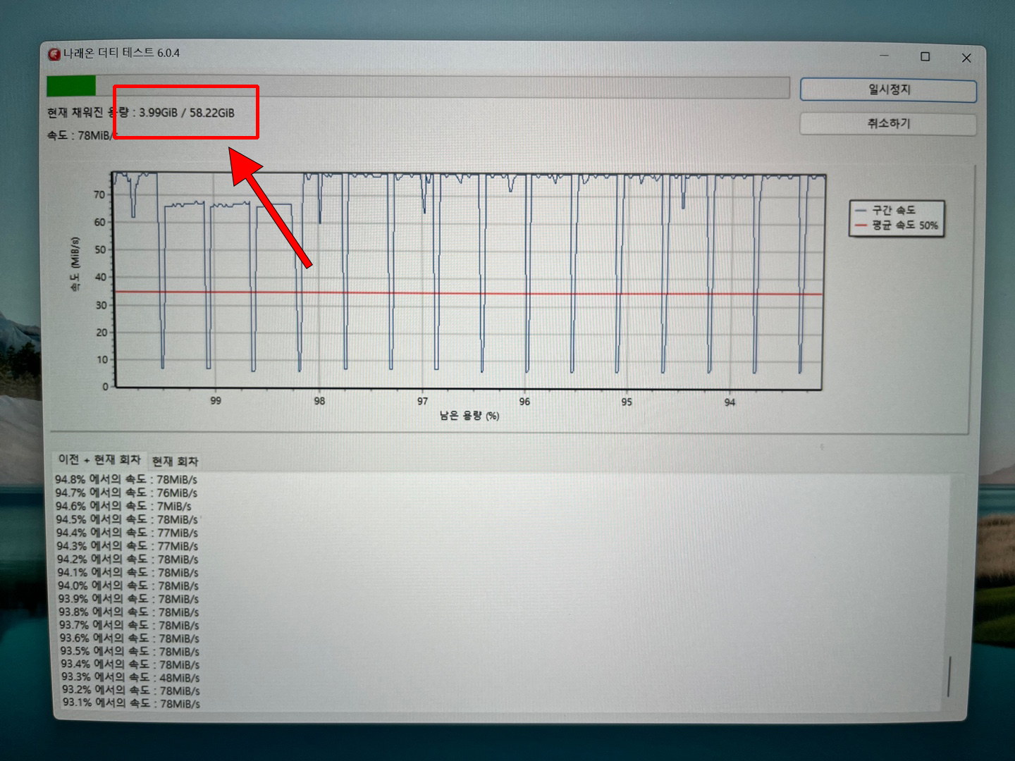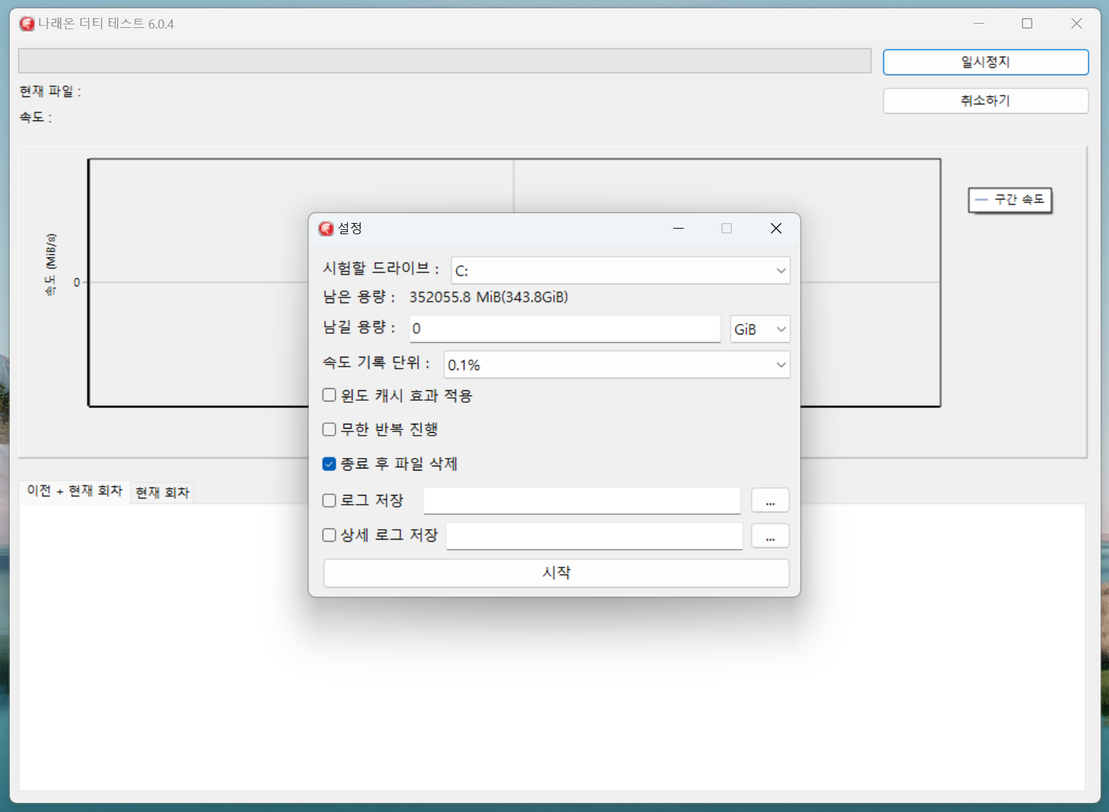 나래온의 더티 테스트 프로그램은 선택된 디스크의 표시 용량을 처음부터 끝까지 채워가면서 속도를 측정합니다. 한마디로 디스크에 최대 부하를 줄 수 있으면서 실제 성능을 확인할 수 있는 아주 훌륭한 프로그램입니다.