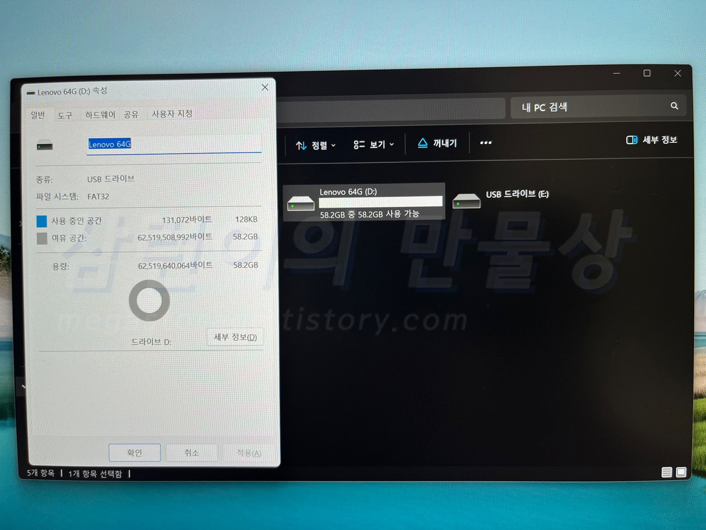 PC에 연결하니 "Lenovo 64GB" 라는 이름으로 정상 인식 되었습니다. 표시 용량은 58.2GB 입니다. 64GB 용량을 가지는 메모리이지만, 윈도우의 용량 표기법으로 인해 58.2GB는 정상입니다.