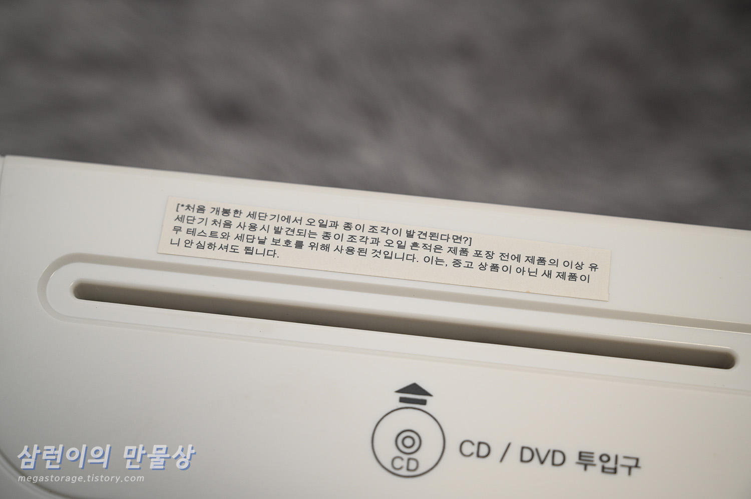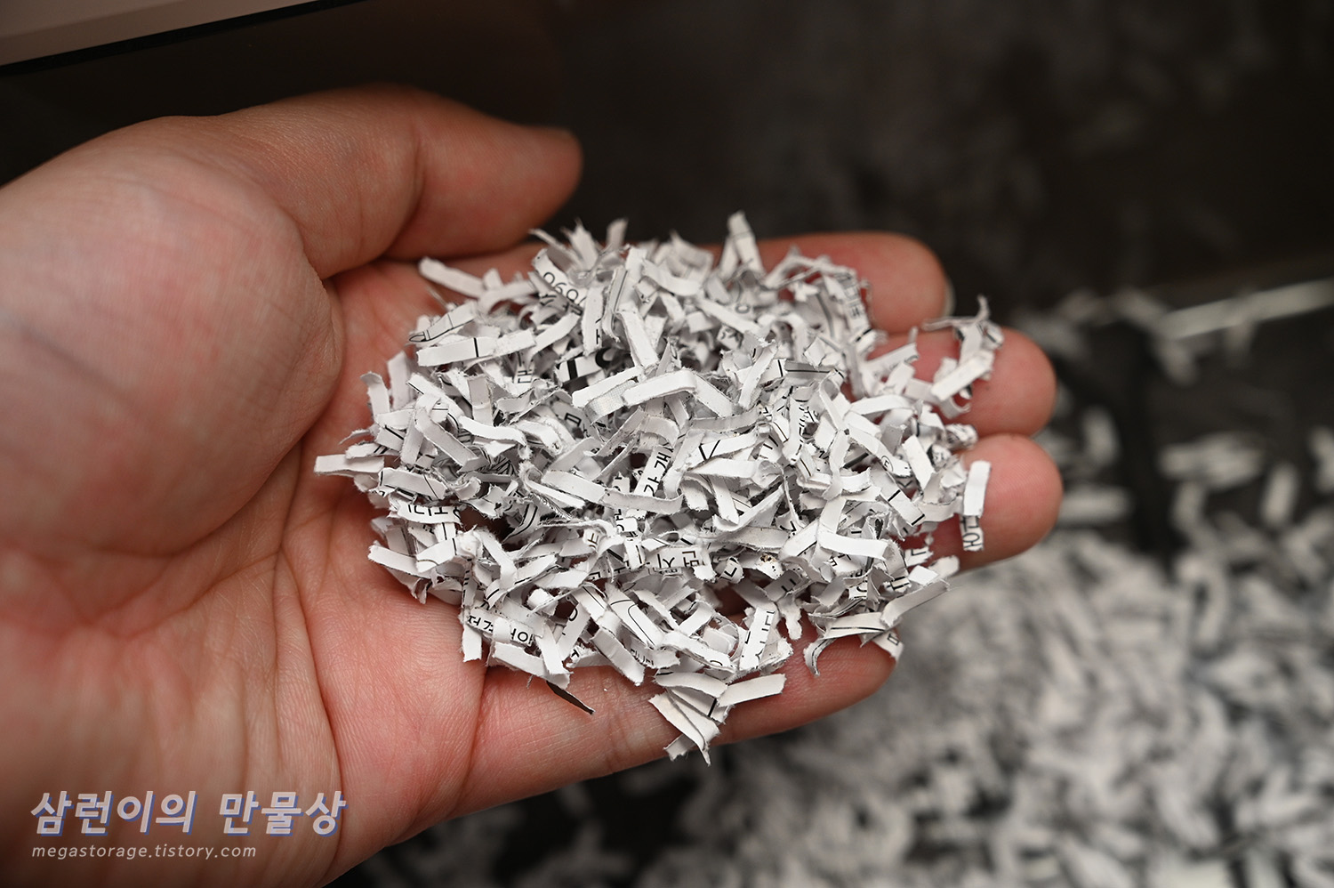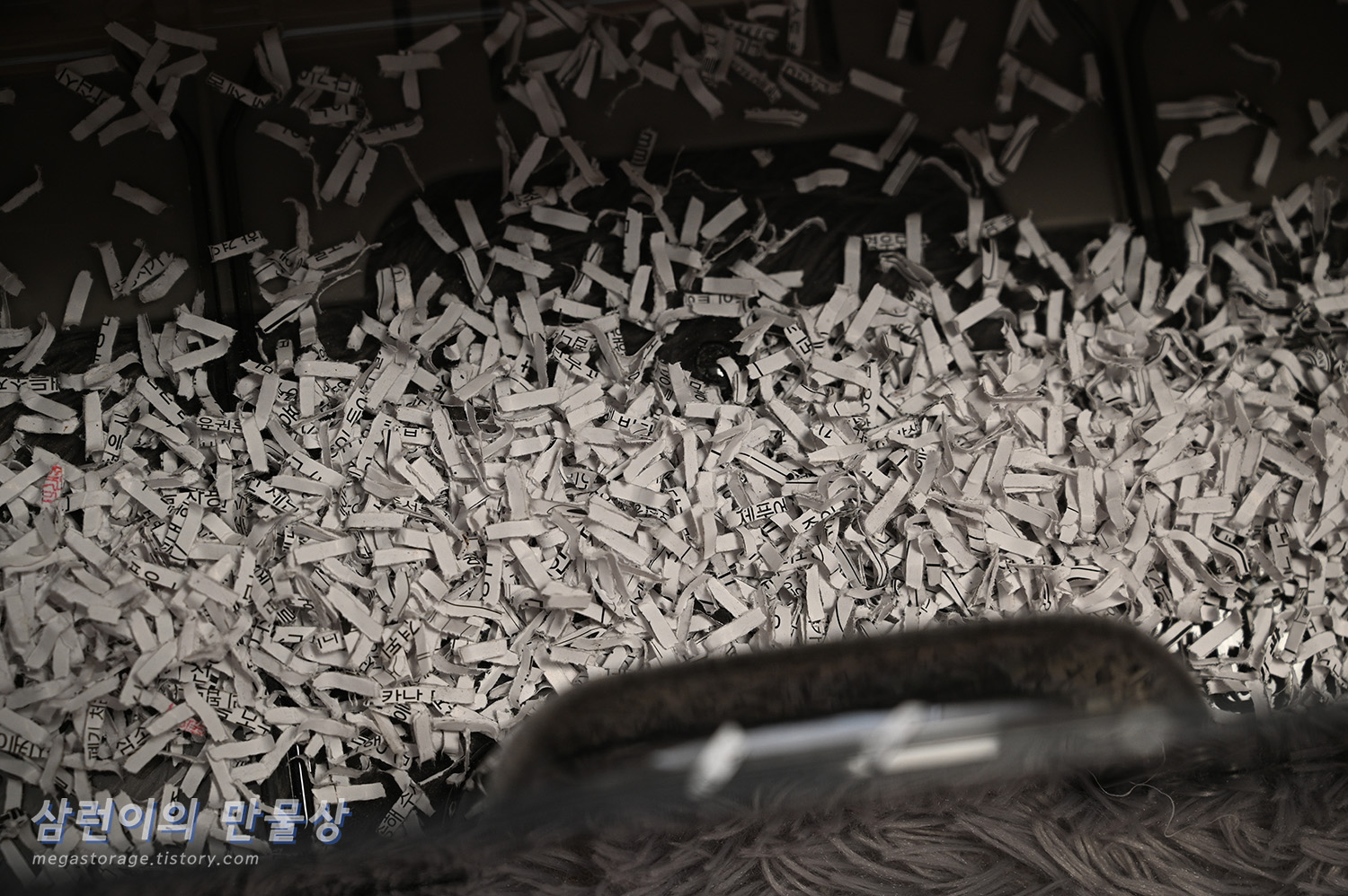 그리고 해당 세단기의 구조적 특성상... 보관함을 열면, 세단이 완료된 내용물이 주변으로 우수수 떨어집니다. 보관함이 가득 찬 상태라면 세단기 안쪽으로 떨어지며, 세단기 내부의 배출구에 머물러있던 잔여물들이 바닥으로 떨어집니다. 그래서 세단이 완료된 내용물들을 처리하기 위해 보관함을 열면... 또 다른 작은 지옥이 시작됩니다.