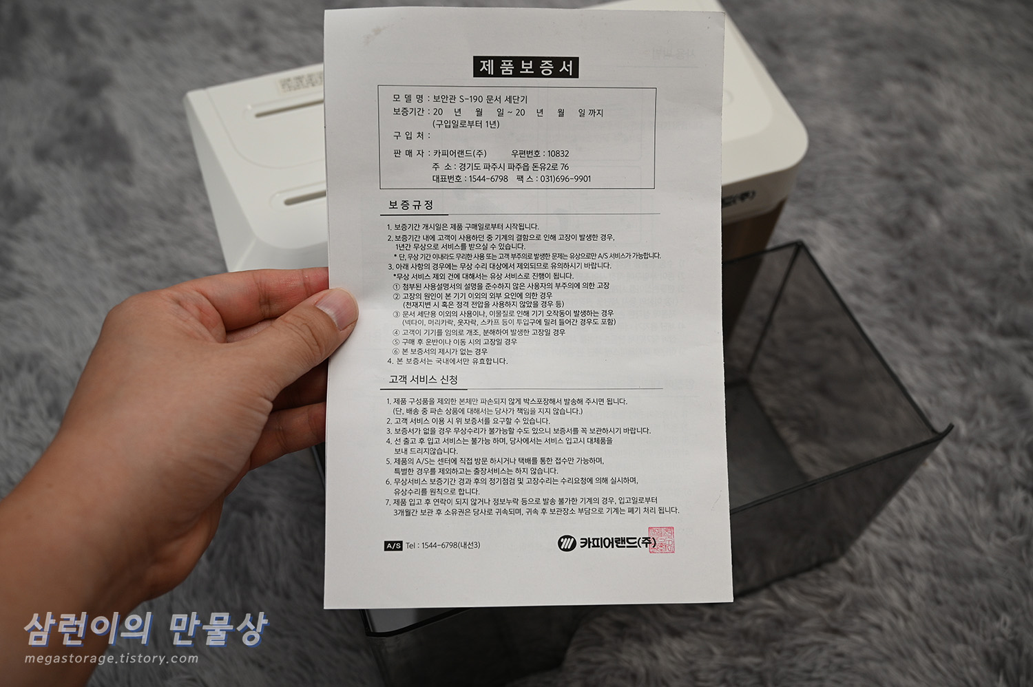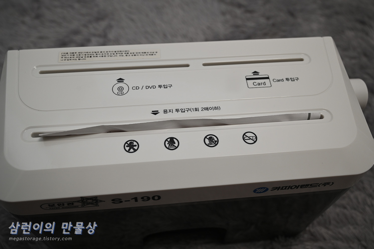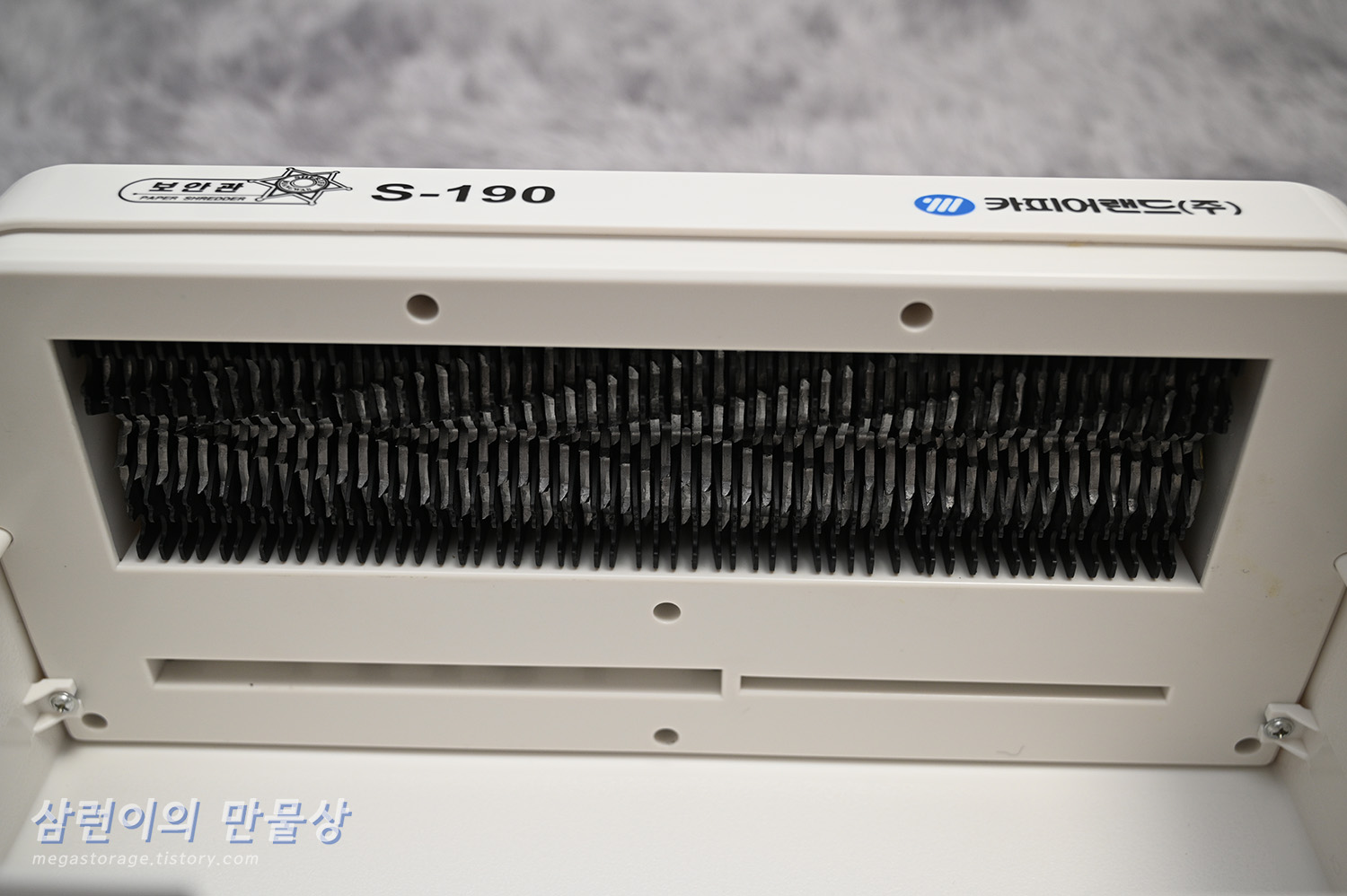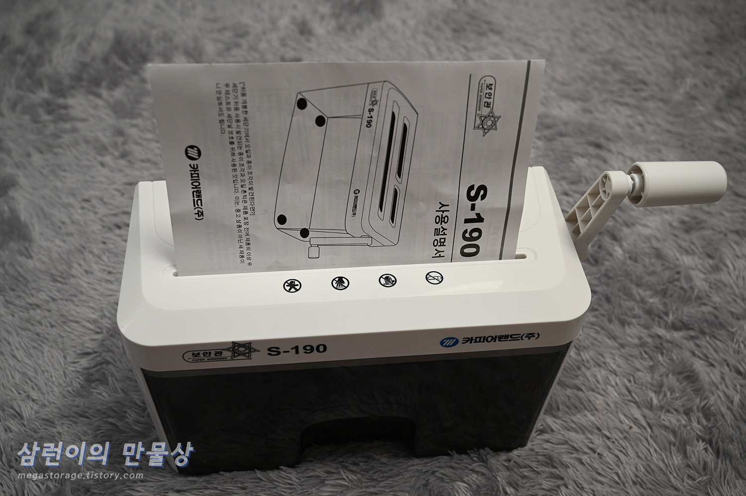 카피어랜드의 S190 수동 세단기입니다. 근데 이 제품의 모델명이 "S190"이 맞는지, "S-190"이 맞는지 알 수가 없습니다. 제품과 박스엔 S-190 이라고 되어 있지만 인터넷 상품 설명서에는 S190이라고 되어 있습니다.