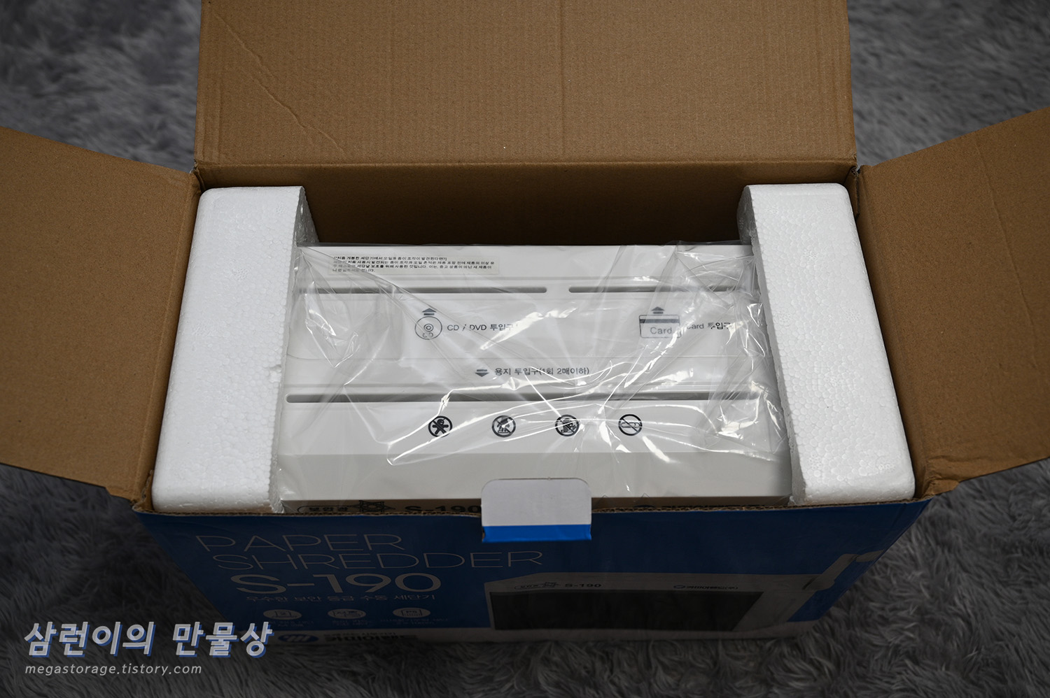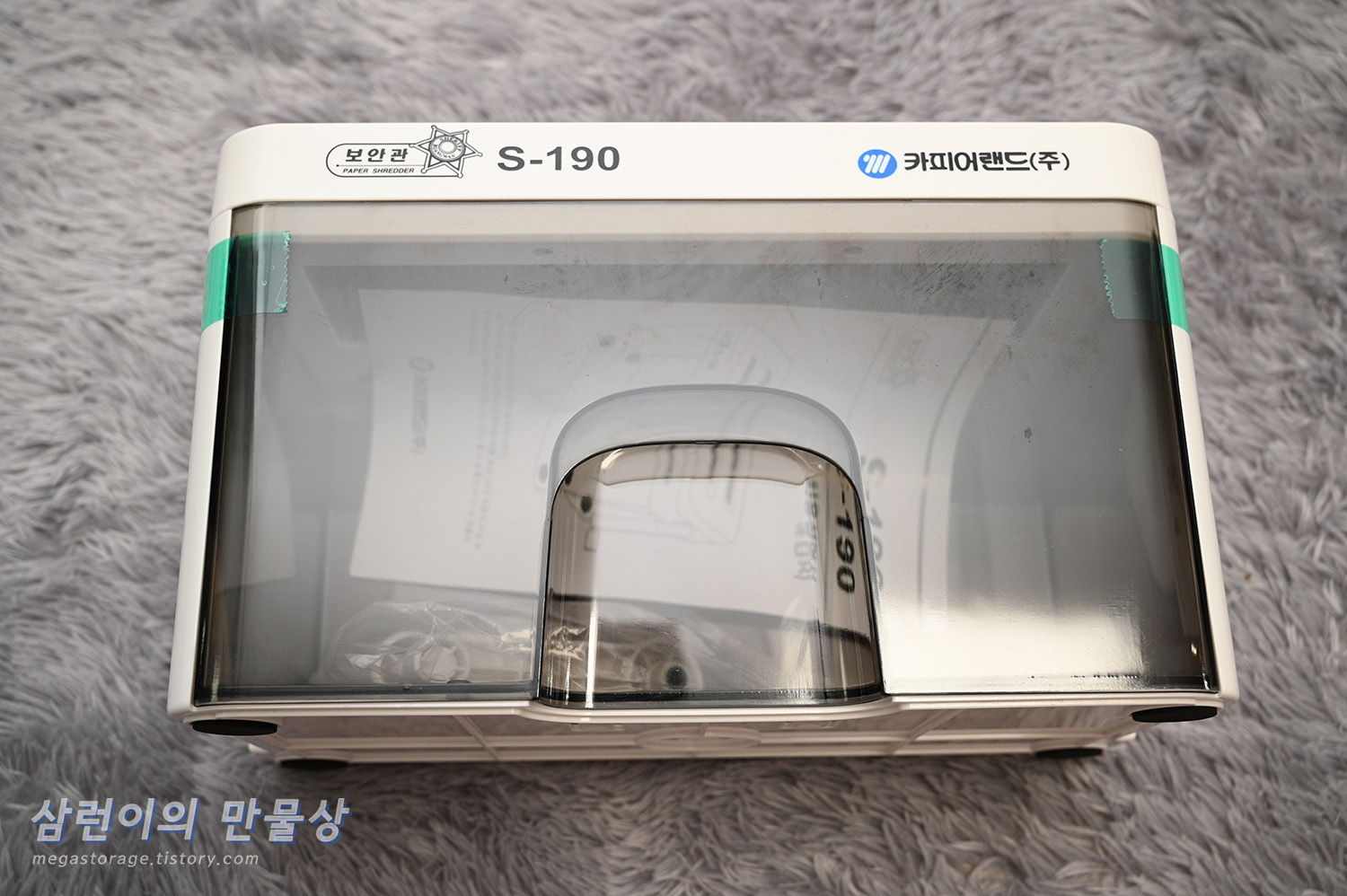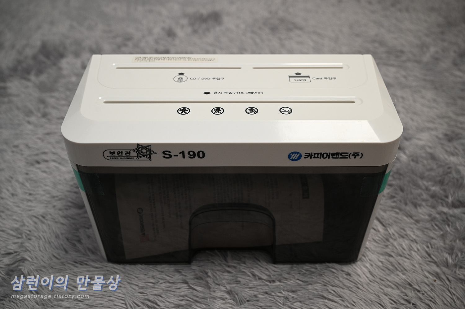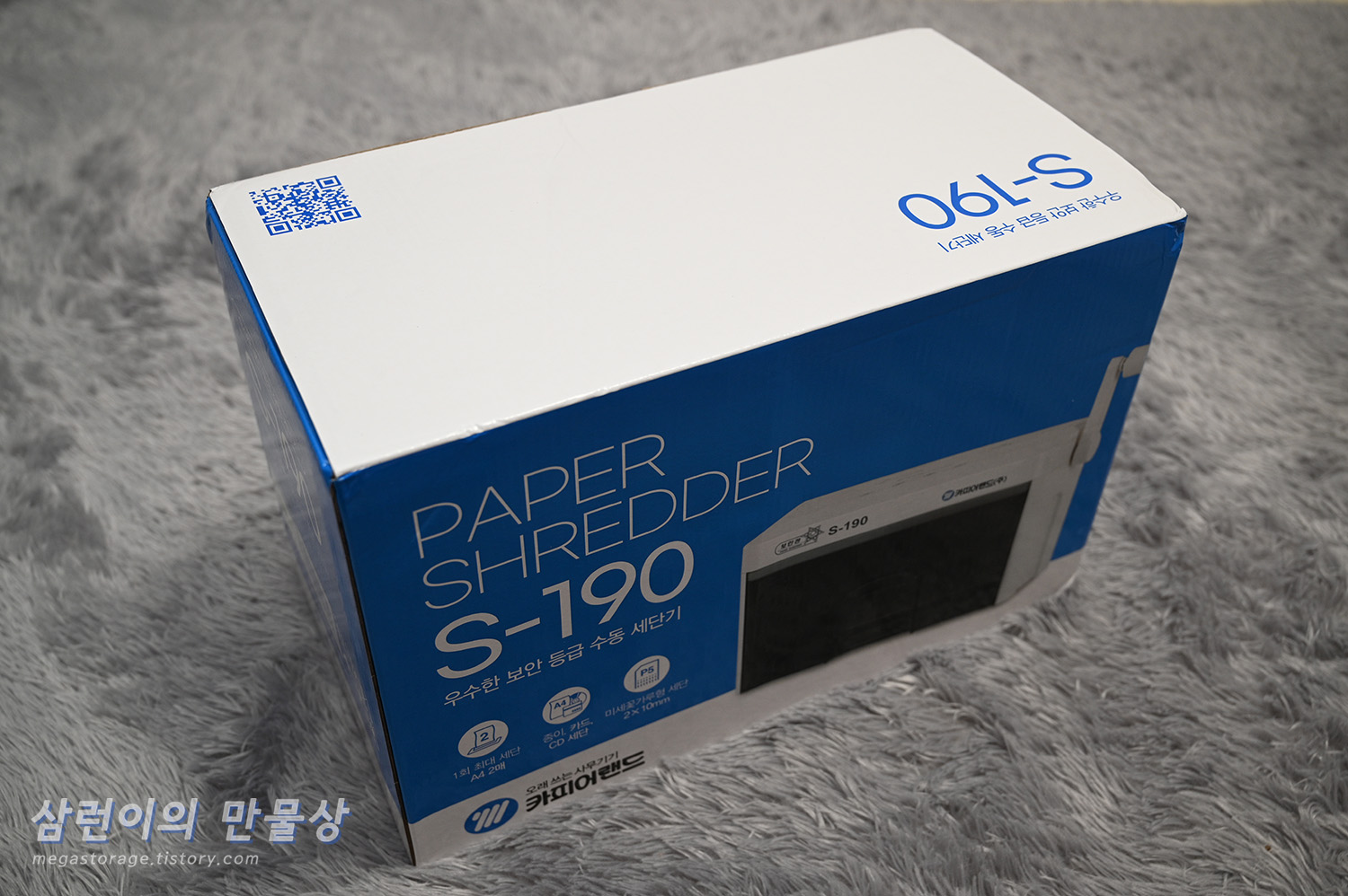 쿠팡에서 주문한 후 다음 날 도착했습니다. 카피어랜드의 S190 수동 세단기 입니다. 겉 포장은 깔끔하네요.