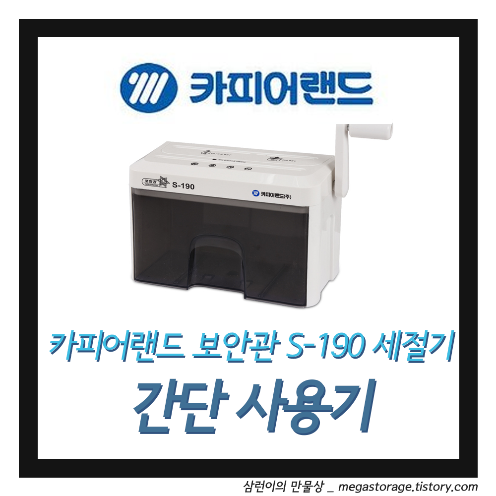 쿠팡에서 구매할 수 있는 카피어랜드의 수동 미니 문서 세단기인 S190 입니다. A4 용지 사이즈를 세단할 수 있으며 미세 꽃가루 형태로 분쇄됩니다. 카드나 CD도 세단할 수 있네요. 수동으로 돌려서 세단하는 형태입니다.