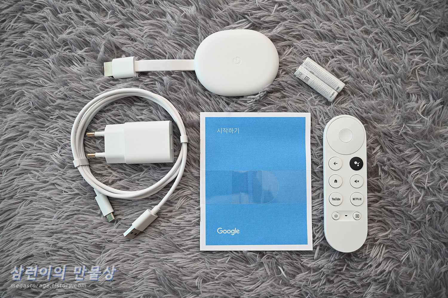 전체 구성품입니다. 구글 크롬캐스트 4세대, USB-A to USB-C 케이블, 전원 아답터, 사용자 설명서, 리모컨 및 AAA 건전지 입니다.