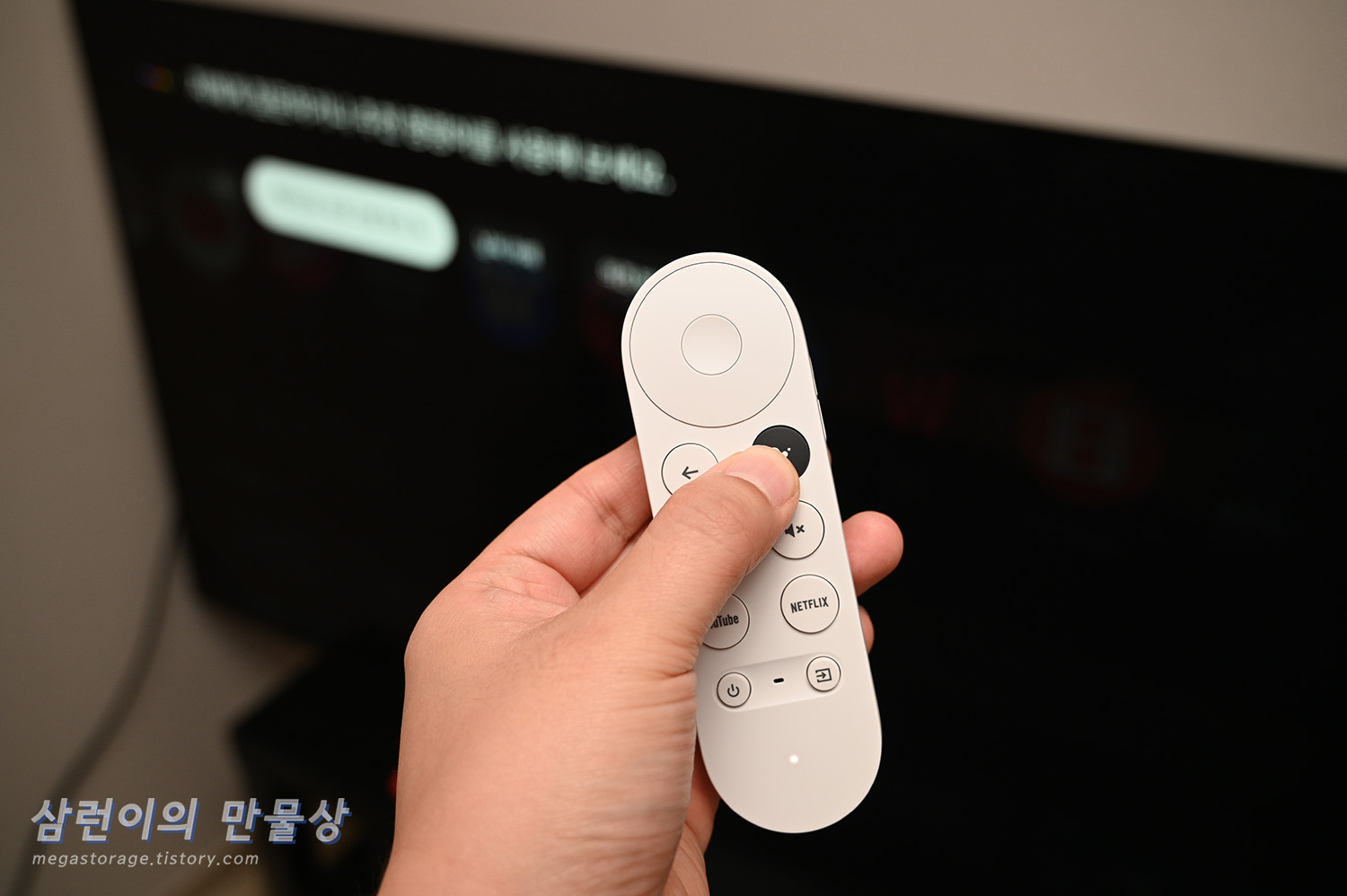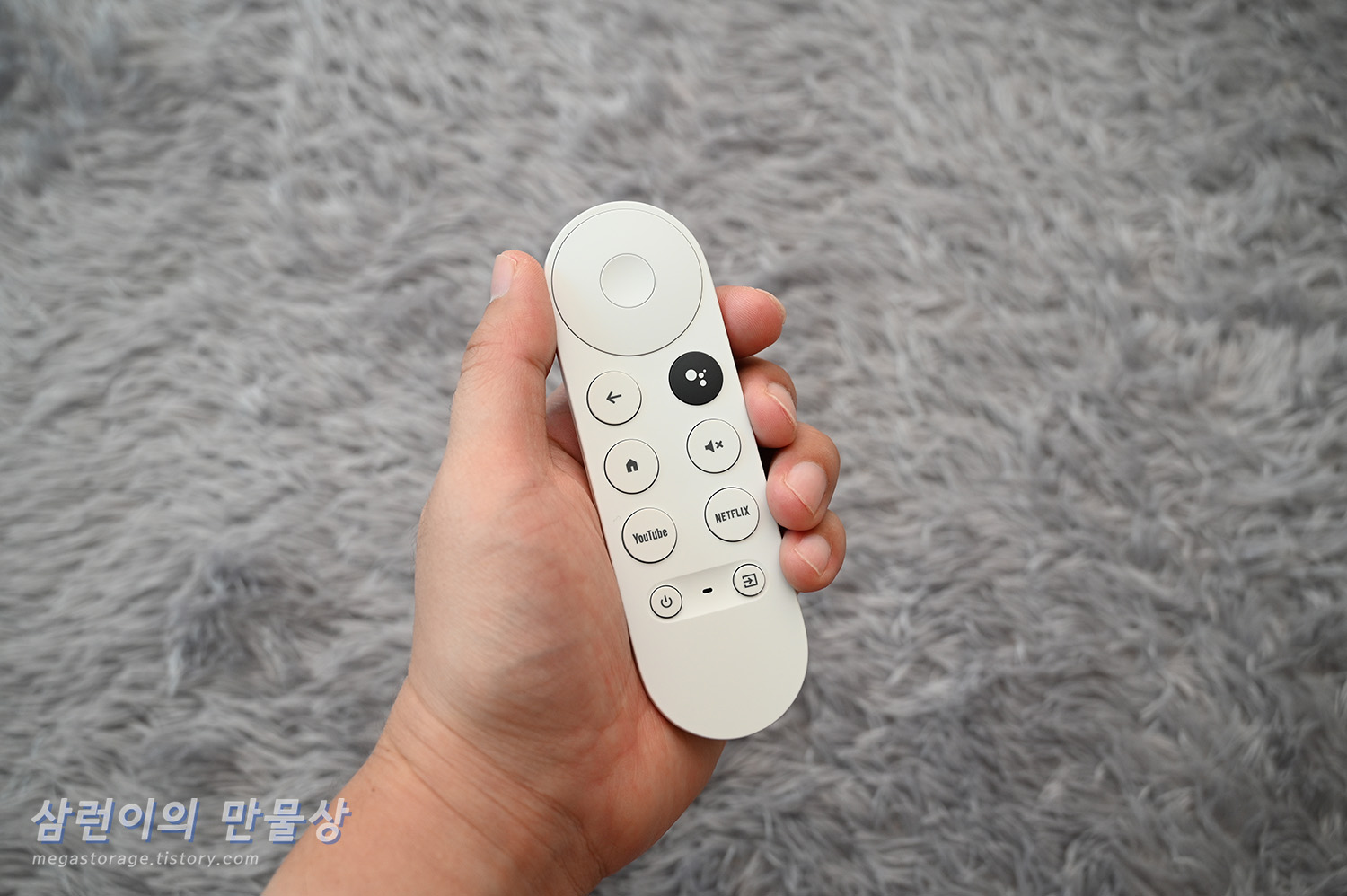 구글 크롬캐스트 4세대의 리모컨은 정말 깔끔하고 귀엽습니다. 하얀색이다보니 때가 탈 까봐 걱정되네요. 각 버튼은 필요한 기능들만 있습니다. 방향키, 뒤로가기, 홈, 유투브, 전원 등등..