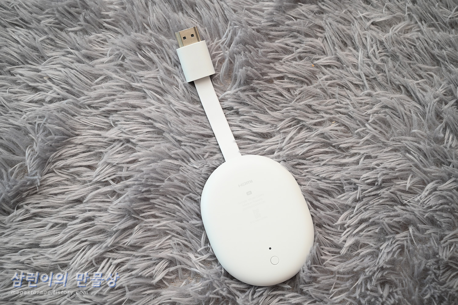 구글 크롬캐스트 4세대 기기입니다. 기기 본체와 HDMI 케이블이 일체형으로 되어 있습니다.