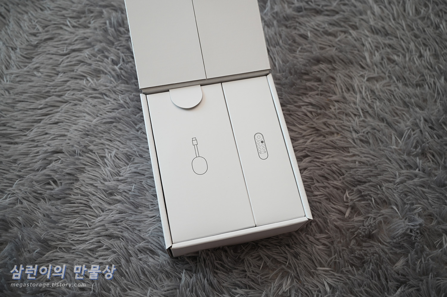 비닐 제거 후 박스를 개봉해보니 좌측엔 크롬캐스트 4세대, 우측엔 리모컨이 있습니다.