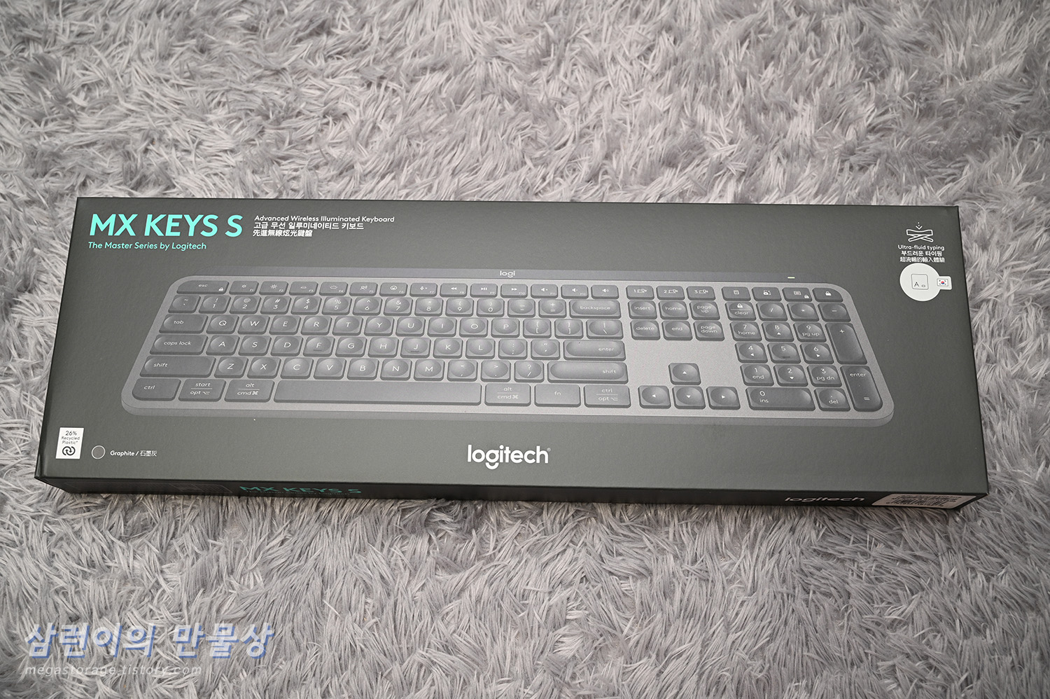 로지텍(Logitech)의 MX KEYS S 키보드입니다. 상단에 있는 '고급 무선 일루미네이티드 키보드' 문구가 인상적입니다. 진짜 고급스러운 느낌이 들거든요.