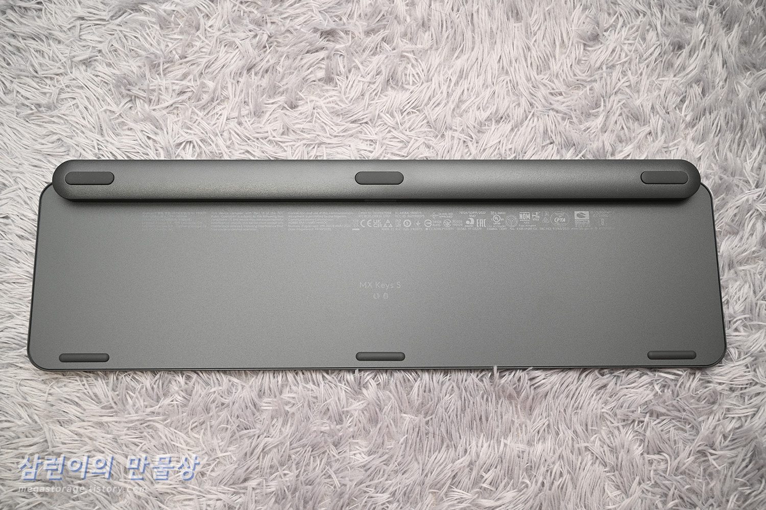 로지텍 MX KEYS S 키보드의 바닥면에는 미끄럼 방지를 위한 고무 패드가 있습니다. 키보드의 각도는 임의로 지정할 수 없습니다.