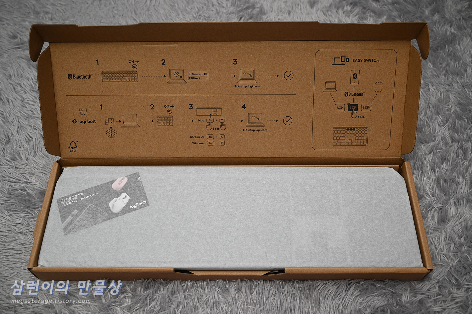 박스를 개봉하면 친환경 종이 포장지에 감싸져있는 MX KEYS S 키보드와, 박스 자체에 기재되어 있는 간단한 사용 매뉴얼을 볼 수 있습니다.