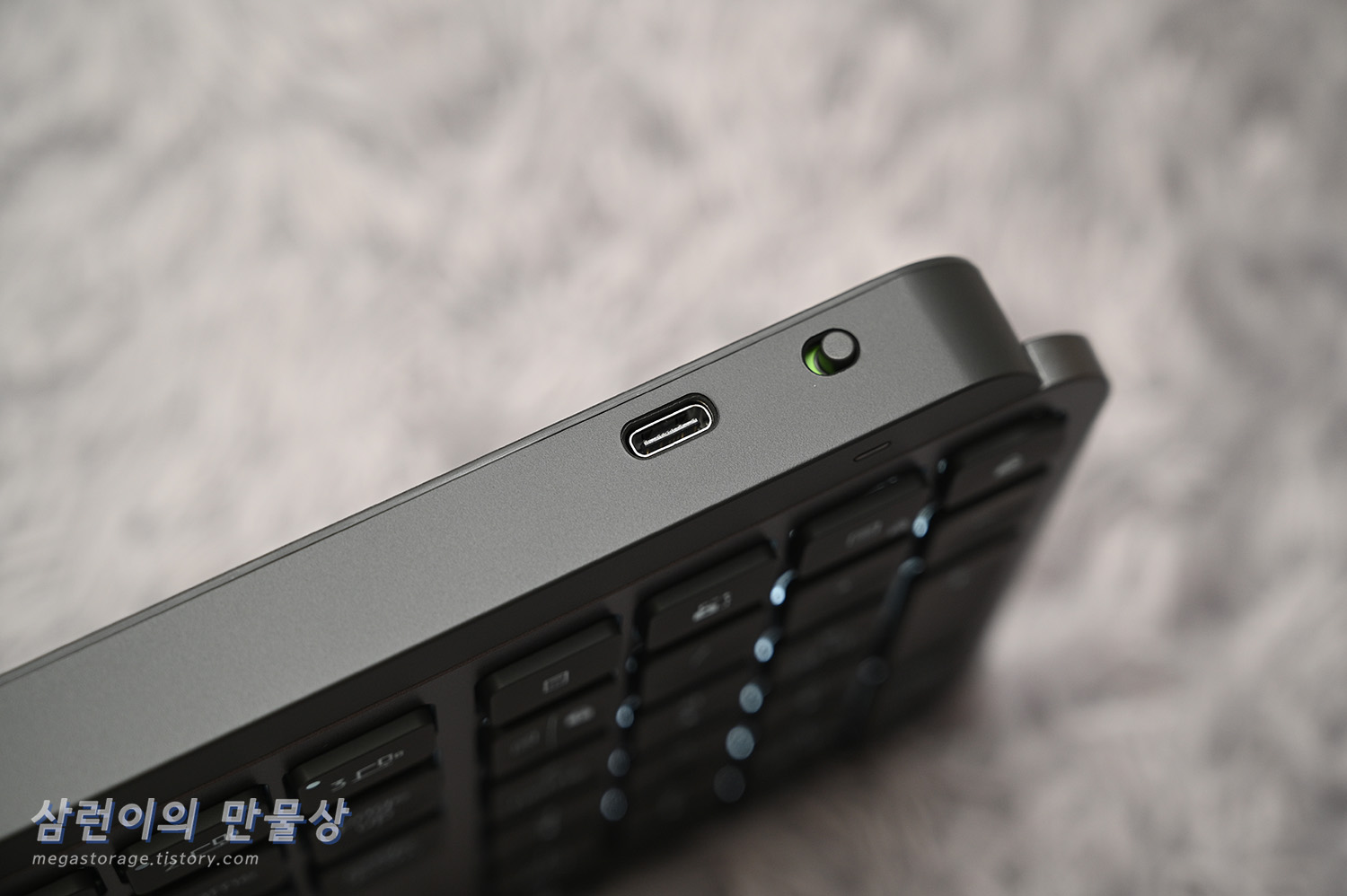 로지텍 MX KEYS S 키보드의 우측 상단에는 전원 ON/OFF 스위치와 USB-C 포트가 있습니다. 전원 스위치는 말 그대로 전원을 켜거가 끄는 스위치이며 USB-C 포트는 PC와 유선으로 연결하거나 충전을 할 때 사용합니다.