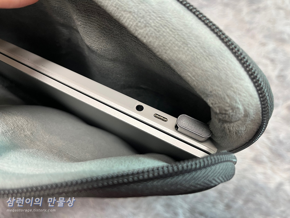 노트북 파우치에 넣어봤습니다. 길게 튀어나오지 않아서, 노트북에 장착한 상태로 파우치에 넣어도 파손 우려가 매우 적습니다.