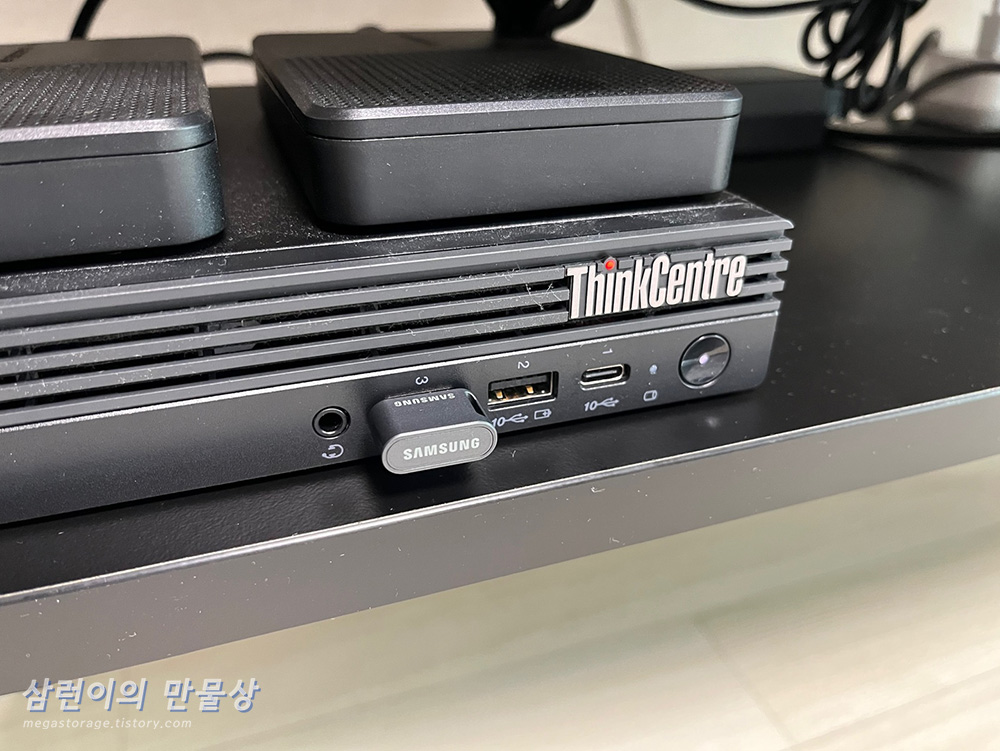 저의 소중한 개인 서버인 레노버 ThinkCentre M80q Gen3의 전면 USB 포트에 장착한 모습입니다. 앞으로 툭 튀어 나오지 않아서 깔끔한 모습입니다.