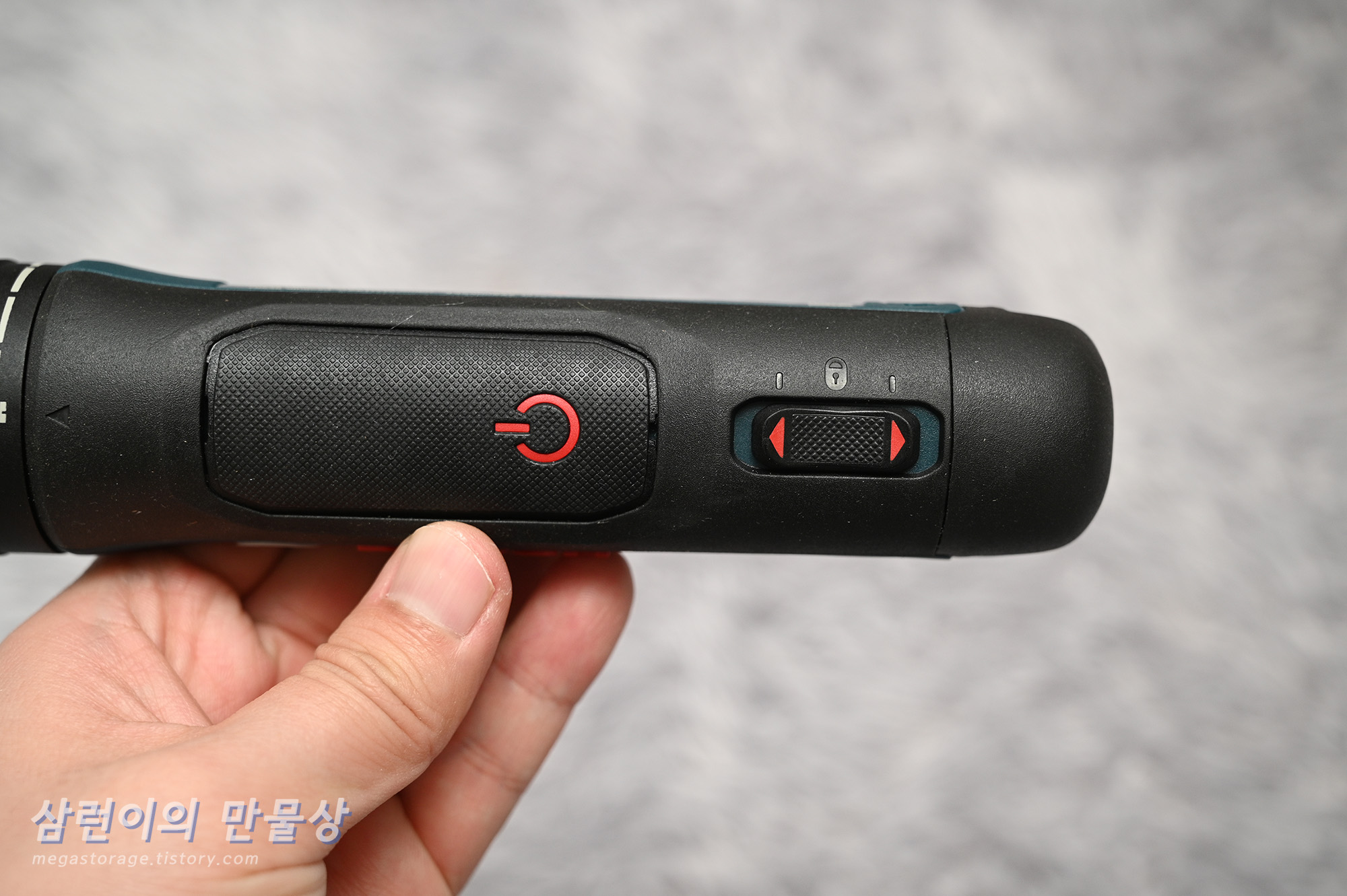 우측의 스위치로 시계방향 잠금(좌측), 반시계방향 풀림(우측) 및 꺼짐(중앙)을 설정할 수 있습니다. 그리고 좌측이나 우측으로 설정 후 중앙의 버튼을 누르면 드라이버 돌아갑니다.