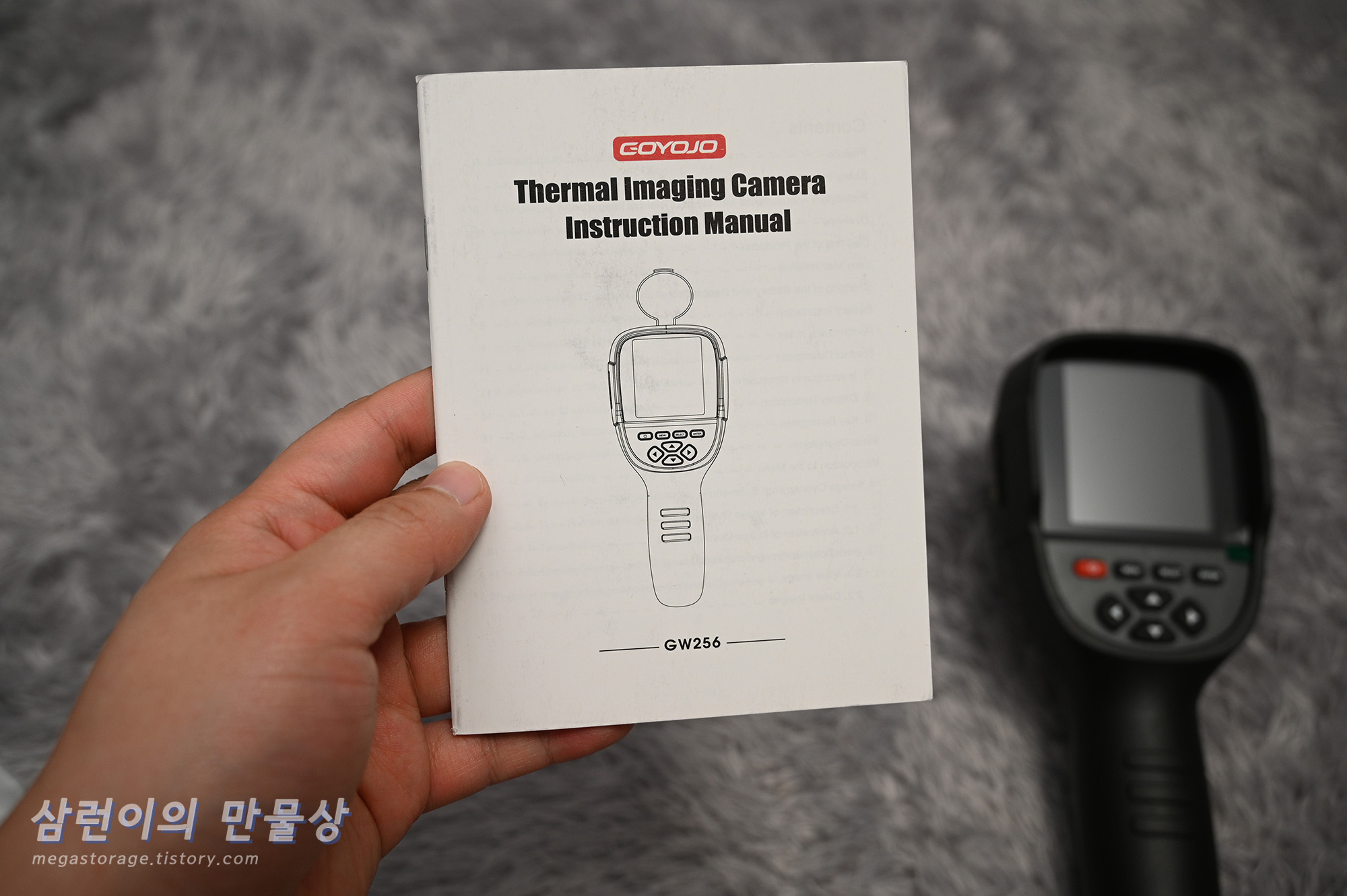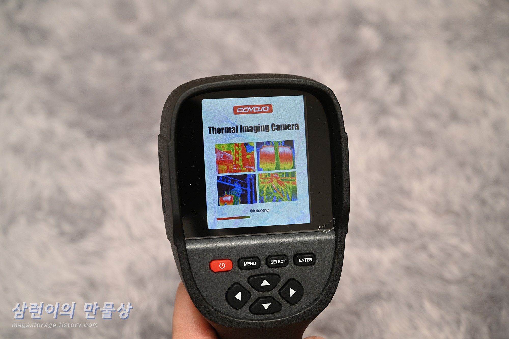 GOYOJO GW256 열화상 카메라입니다. 큰 디스플레이와 여러 버튼이 있습니다.