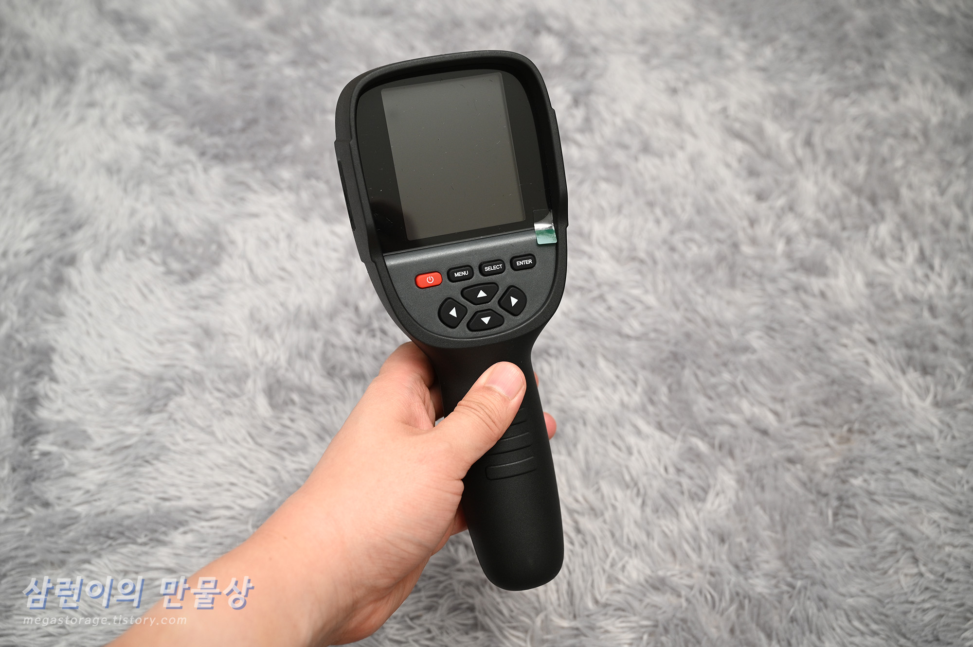 GOYOJO GW256 열화상 카메라의 전원 버튼(좌측 빨간색)을 꾹 누르면 전원이 켜집니다. 켜지는데에 시간이 조금 걸립니다.