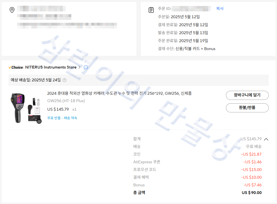 2025년 5월 24일에 알리익스프레스에서 GW256 열화상 카메라를 구입했습니다. 145.79달러에서 코인+쿠폰+프로모션코드+카드혜택을 받아서 최종 97.46달러를 지불했습니다. (보너스 7.46달러는 예치금임)