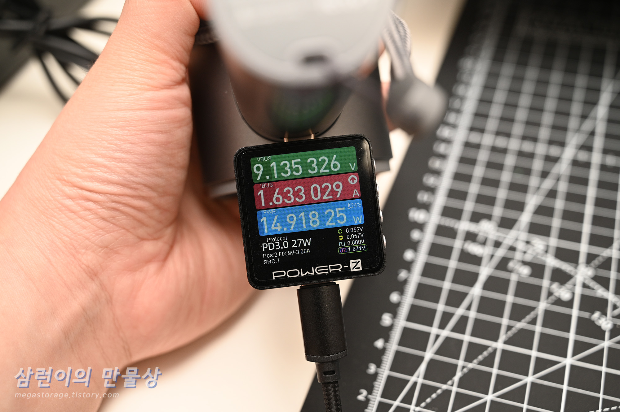 33W 출력 가능한 충전기에 연결해봤습니다. 9V 전압으로 입력되어 평균 15W로 충전 진행되었습니다.
