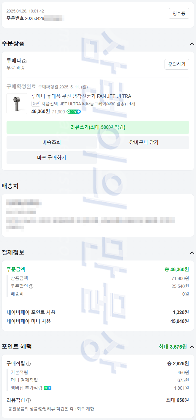2025년 4월 28일에 루메나의 FAN JET ULTRA 티타늄 그레이 모델을 46,360원에 구입했습니다. 적립 예상금액 3,576원을 제외하면 최종 체감 구매금액은 42,784원입니다. 가성비가 정말정말 좋아졌습니다.