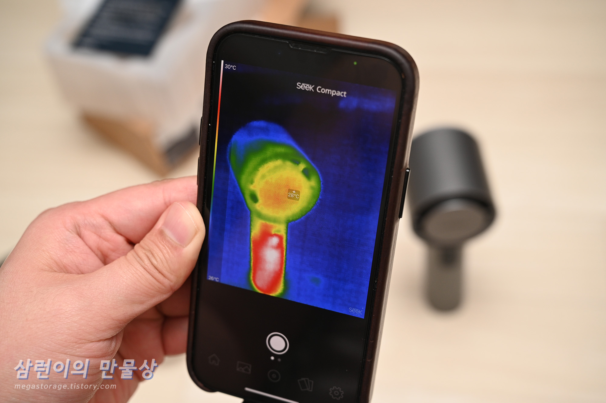 루메나 FAN JET ULTRA의 냉각 모드를 켜면 얼마나 시원해질까? 궁금증이 생겨서 열화상 카메라를 켰습니다. 일반적인 상태의 냉각 패드 온도는 28도로 측정되었습니다.