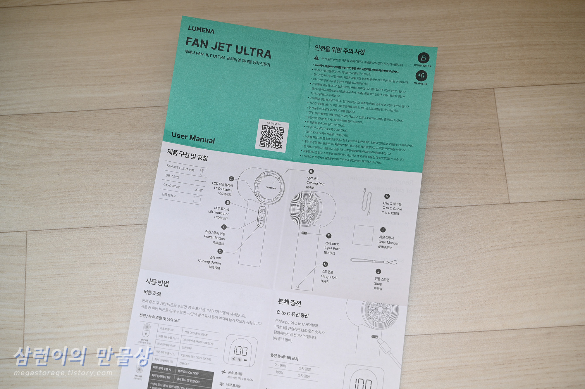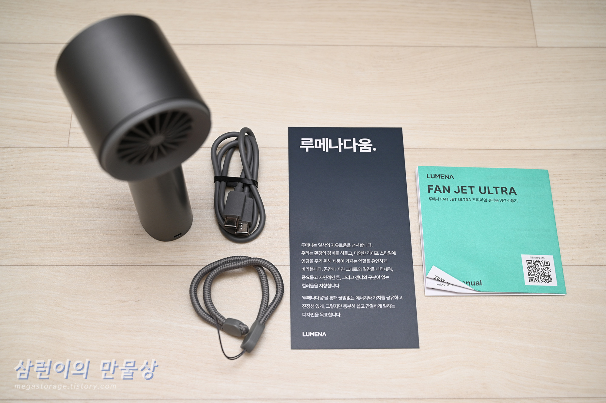 루메나 FAN JET ULTRA의 전체 구성품입니다. 선풍기, 충전 케이블, 스트랩 및 매뉴얼입니다.
