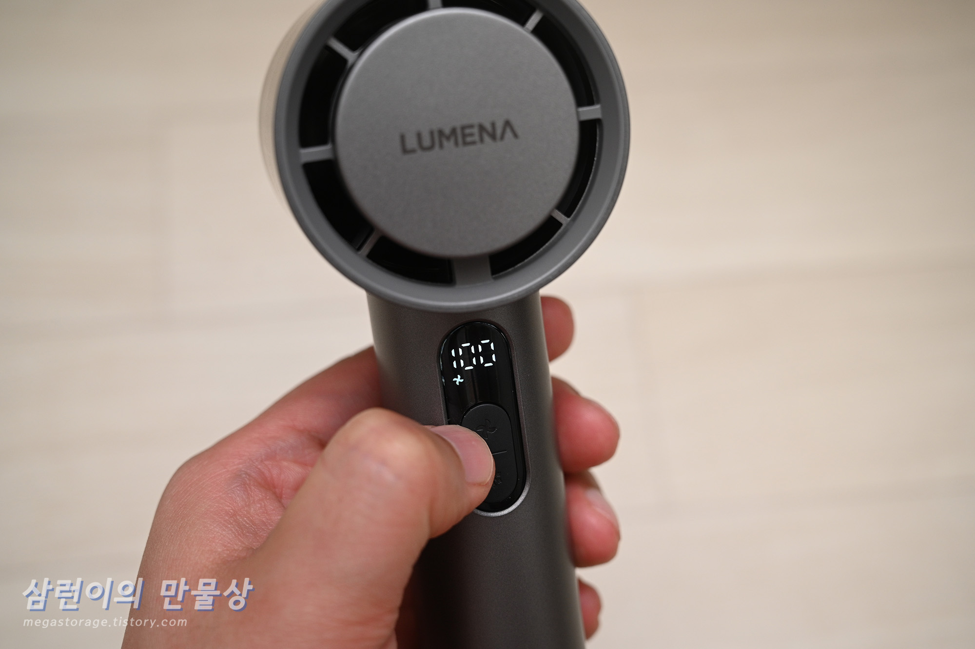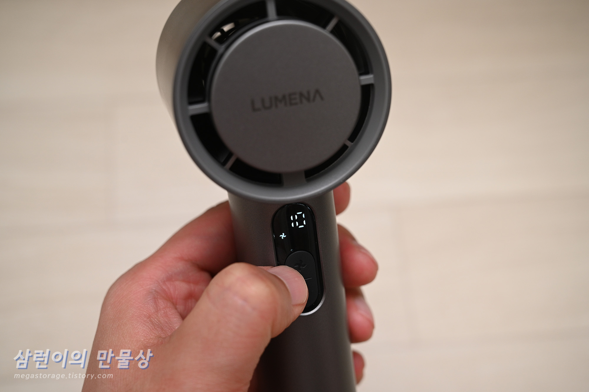 동작 방법은 매우 간편합니다. 꺼진 상태에서 상단 버튼을 짧게 누르면 10% 바람 세기로 동작하며, 상단 버튼을 누를 때마다 10%씩 올라갑니다.