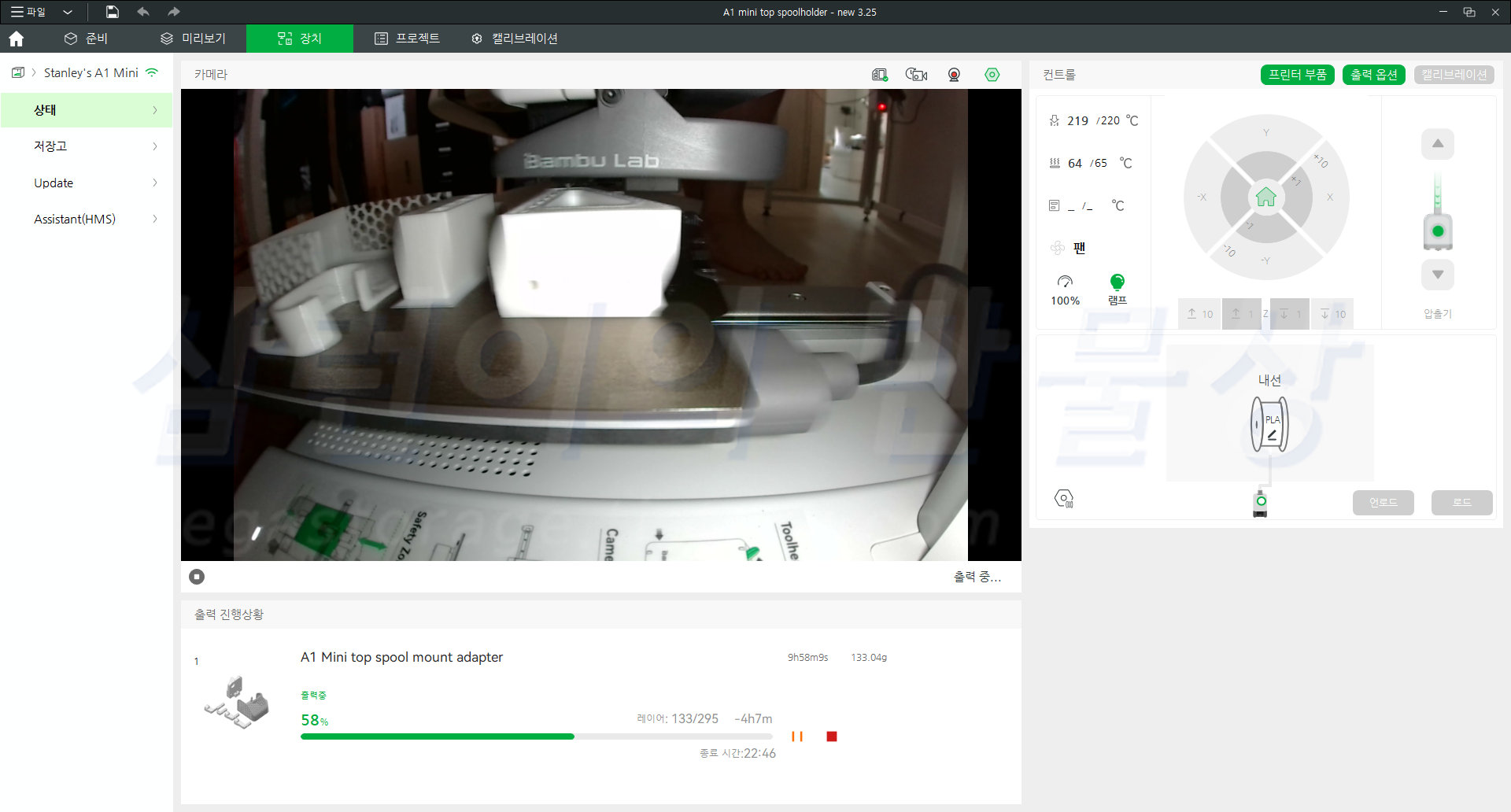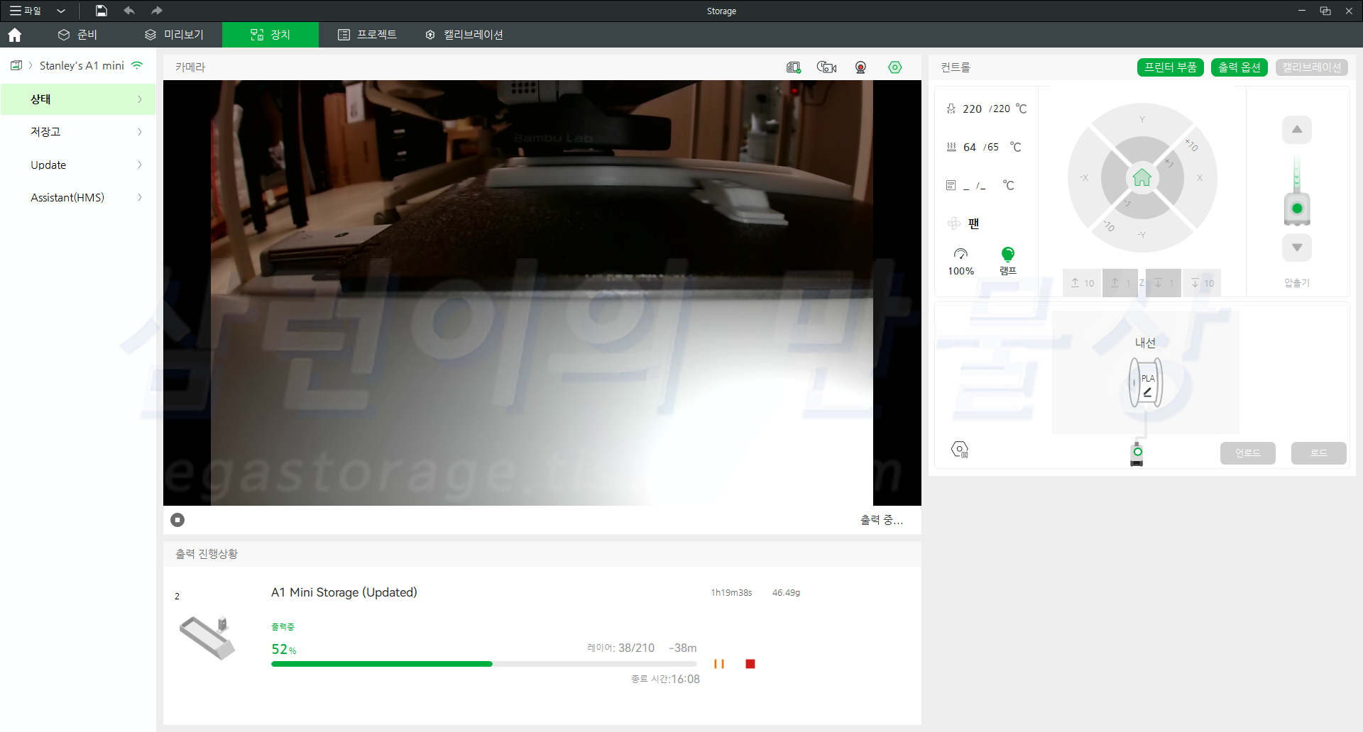 뱀부랩 A1 mini의 카메라 성능은 좋지 않습니다. 집에서 보는데도 불구하고 카메라 화면이 끊겨보입니다. "인쇄가 잘 되고 있긴 하구나" 정도로 참고만 할 수 있는 수준입니다. 위 사진에서 볼 수 있다시피, 노즐 및 베드 온도를 보거나 설정할 수 있으며 인쇄 속도와 램프를 조절할 수 있습니다.