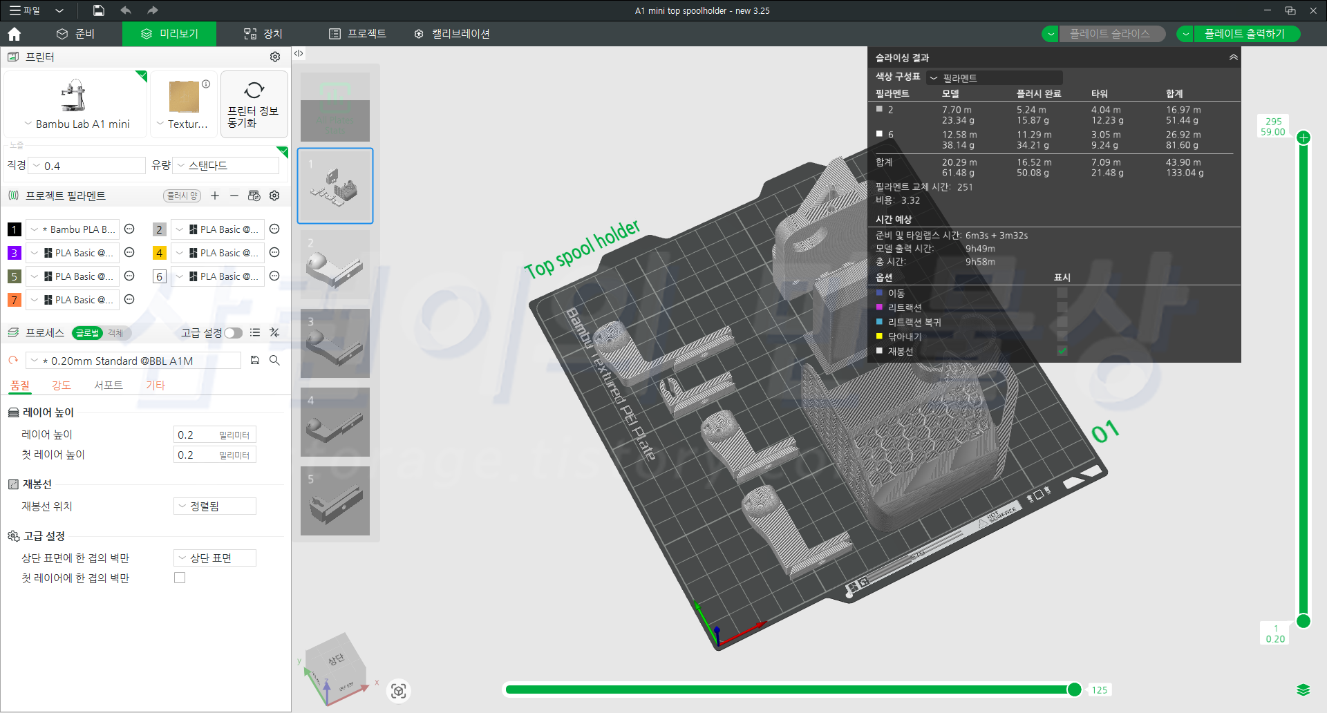 출력을 원하는 플레이트를 선택한 후 '미리보기' 탭으로 넘어가거나 '플레이트 슬라이스' 버튼을 선택하면 G코드 값으로 알아서 준비 과정을 거친 후 '슬라이싱 결과'를 보여줍니다. 위 사진의 모델을 출력하는데 약 1시간 20분 정도 걸린다고 나옵니다.