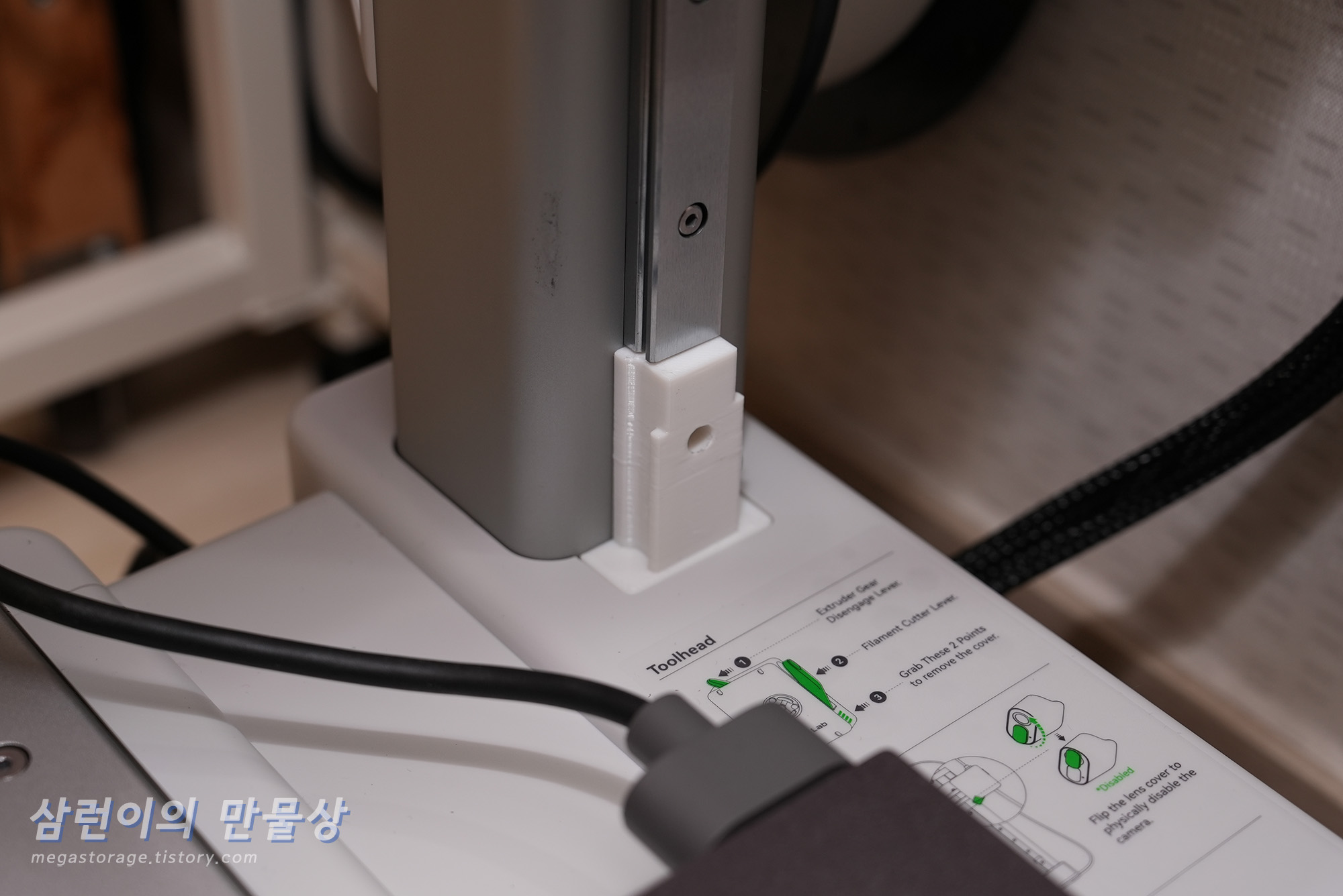 뱀부랩 A1 mini의 필라멘트 거치대는 기기 후면 방향으로 설치됩니다. 이걸 기기 좌측면 방향으로 바꿔주는 어댑터입니다. 후면의 낭비되는 공간이 줄어들어서 깔끔해지는 효과가 있습니다.